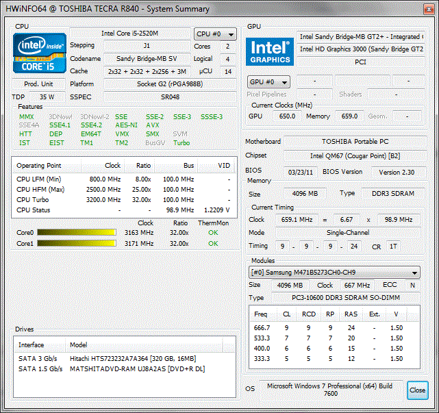 A 2.5 inch disk from Hitachi is used as the hard disk in the Tecra R840-11E. The HTS723232A7A364 supplies a gross memory capacity of 320 GBs. The HTS723232A7A364 is in an upper range with a processing speed of 7200 revolutions per minute and the SATA II interface.