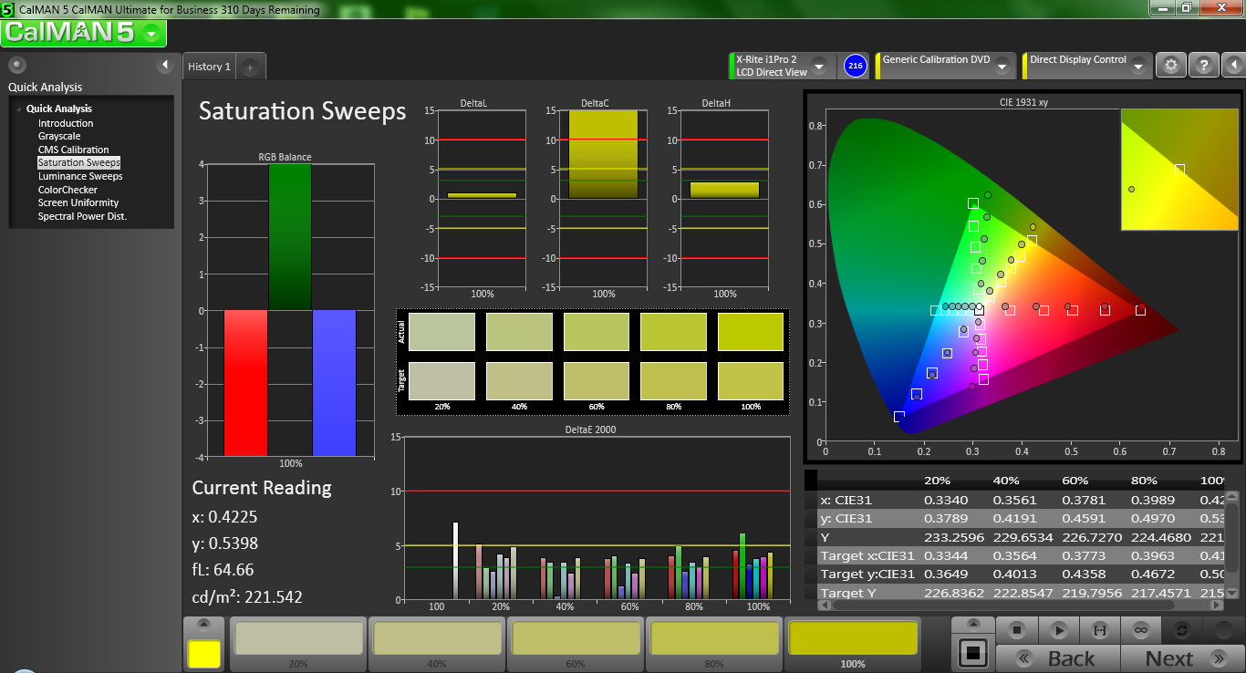 Meanwhile, a more intensive analysis of color accuracy using CalMAN 5 shows an impressive balance of color right out of the box. With an average deltaE2000 of 4.83 (ideal: 0) and a maximum deviation of 8.85 (orange), only the browns/oranges are notably aberrant. Meanwhile, a total gamma of 2.35 (ideal: 2.2) and a slightly warm CCT Average of 6224 are all acceptable values. Post-calibration, some of these items improved slightly, but performance was mostly in line to begin with.