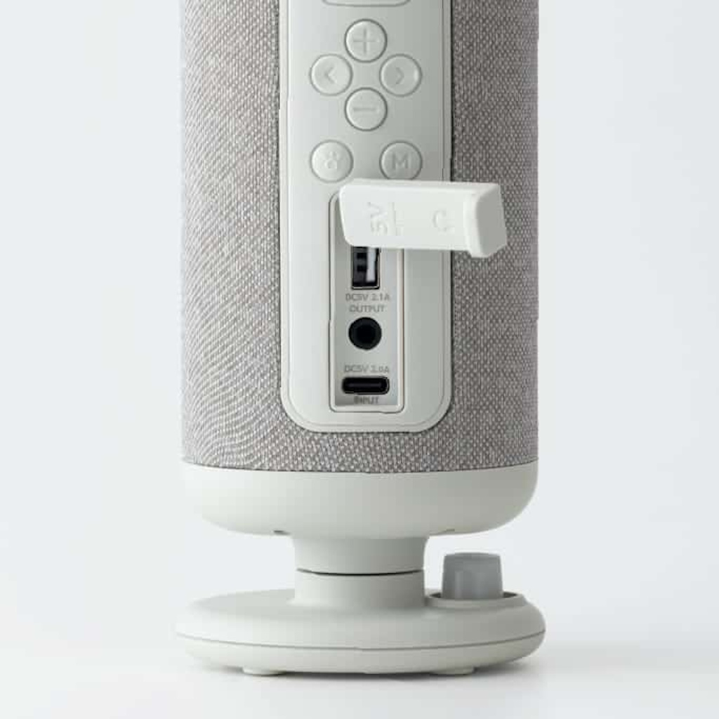 The Crankspeaker uses a 45 mm driver with a passive radiator to play audio when connected to Bluetooth 5.3 audio sources or from its built-in FM radio. An LCD panel on the top displays the radio station or time along with the remaining battery percentage. Side buttons control the unit, including the flashlight (95 lumens high, 20 lumens low) and area light (20 lumens high, 2 lumens low). The USB Type-A port can be used to charge smartphones and other devices (DC 5V/2.1A max).
