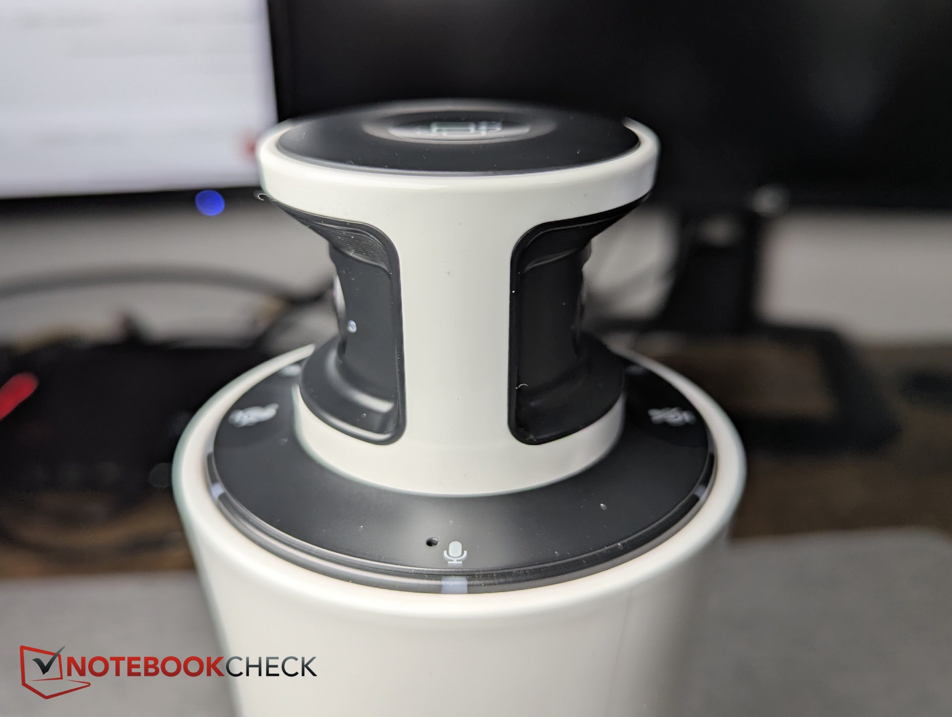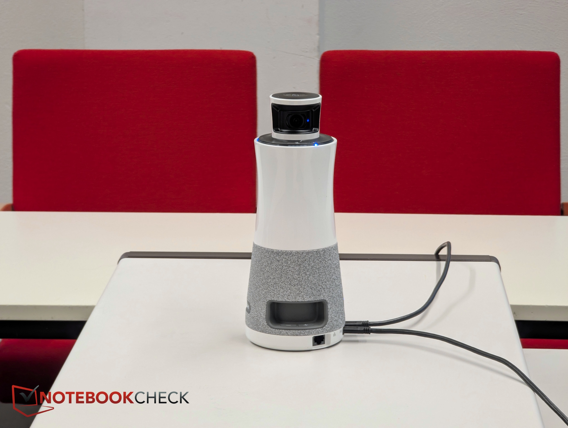 The column-shaped plastic housing places the two 180-degree cameras at the very top. This makes sense, as the cameras rise above laptop displays and other obstacles, positioning them close to eye level without blocking participants’ line of sight to each other. The three microphones are also located at the top.