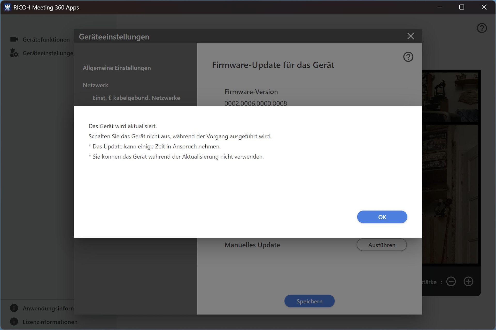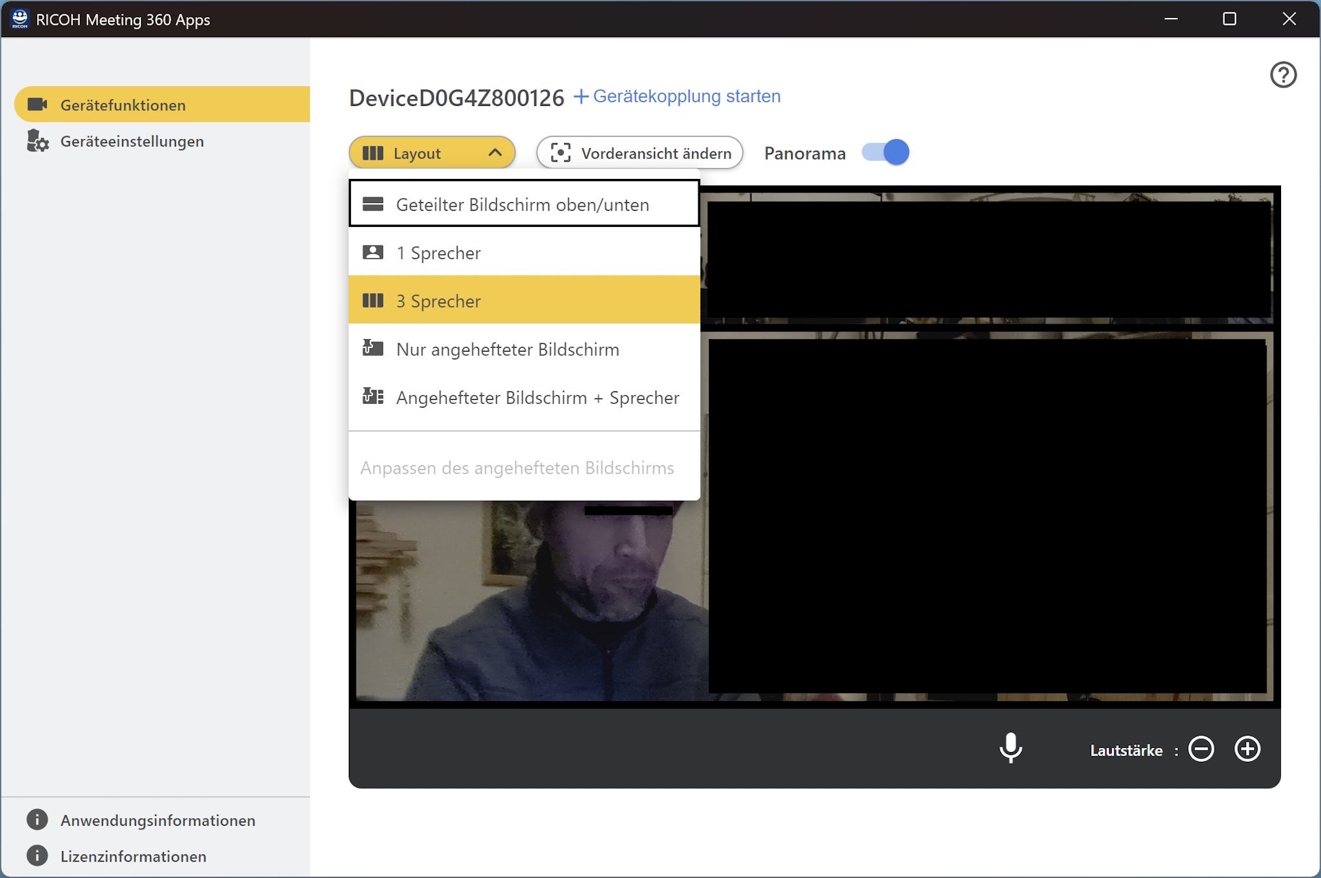 Ricoh also provides the Ricoh Meeting 360 app. From there, users can initiate firmware upgrades (the device must be connected via LAN beforehand), configure layout preferences, and adjust other settings.