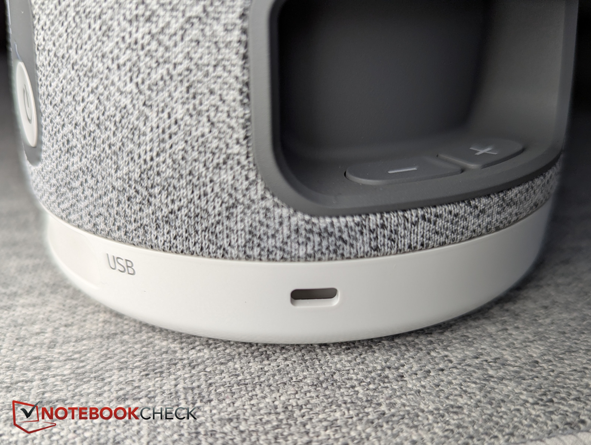 In the lower third, three speakers are wrapped in gray fabric. Volume buttons are located on both sides of the device. All ports are positioned at the bottom.
