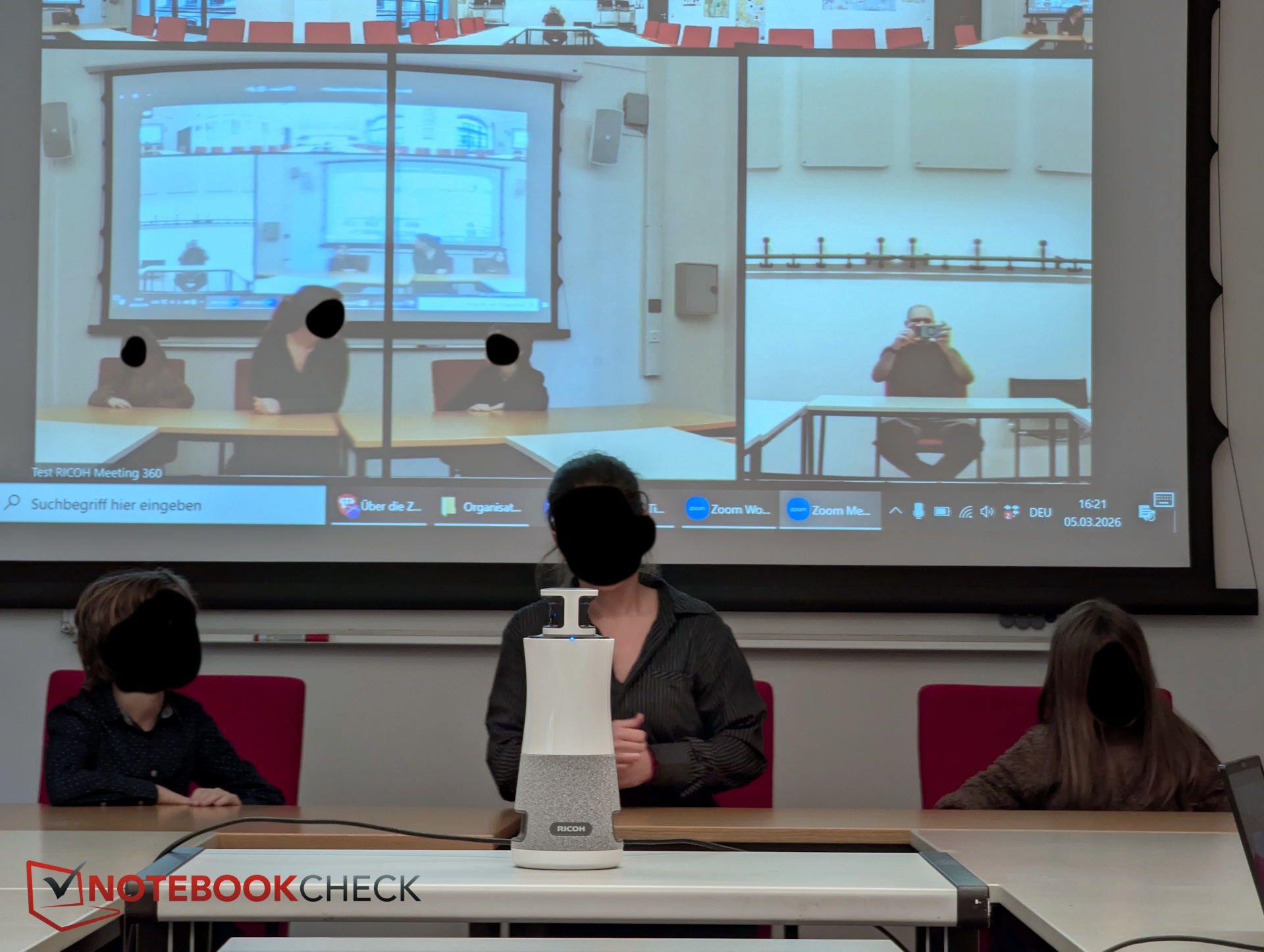 All zoom operations are purely digital. If someone sits at the very back of the room shown here, the image becomes quite small and somewhat blurry. The system is best suited for smaller conference rooms where everyone sits around the same table. In seminar-style scenarios with more distant participants, performance can become more challenging. Ricoh specifies the video range as 3.6 m.