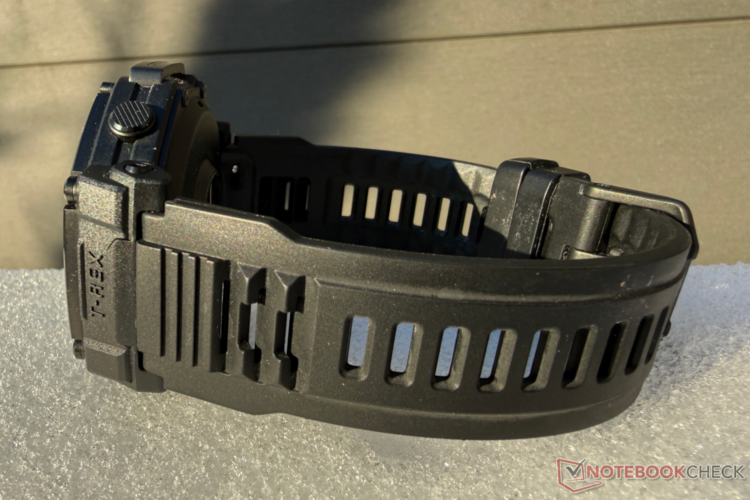 The manufacturer states that the 700 mAh battery in the 48 mm version of the T-Rex 3 Pro that we tested has a battery life of up to 25 days. The 44 mm version only has space for a 500 mAh battery, which is said to be good for up to 17 days.