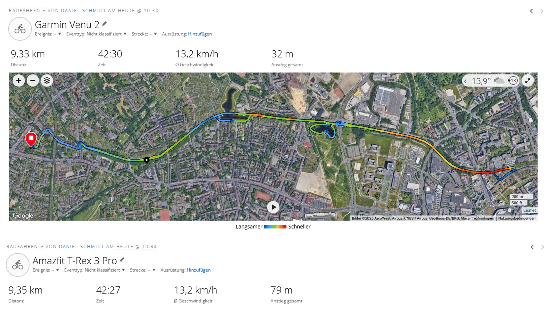 The T-Rex 3 Pro offers positioning via six satellite systems such as GPS. In the test, the connection was established without long waiting times. The determined accuracy is high, also in relation to a Garmin Venu 2 as a reference. There were only major deviations when determining the altitude meters covered on a bike tour.