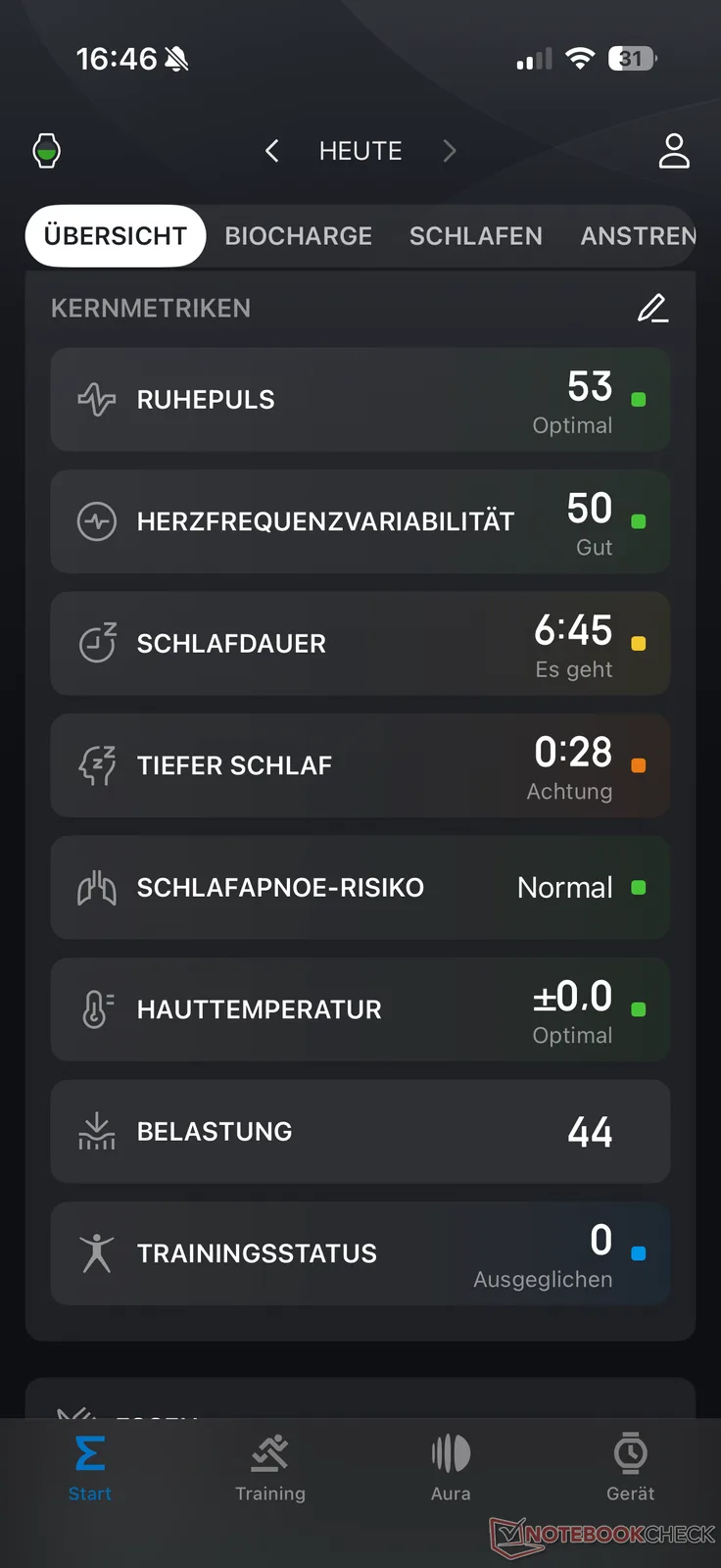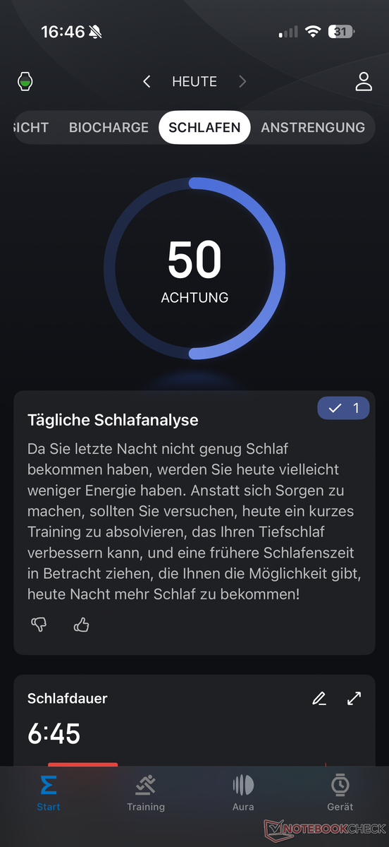 A brief overview of the previous night can be viewed directly on the watch. As with many other functions, a detailed analysis is provided in the Zepp app. While weekly and monthly trends can be accessed free of charge, some AI features, such as helping you fall asleep with sounds adapted to your heartbeat, can only be used with the paid Aura subscription.