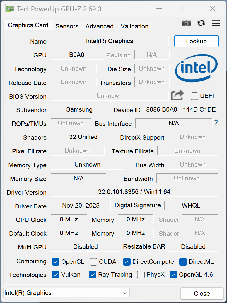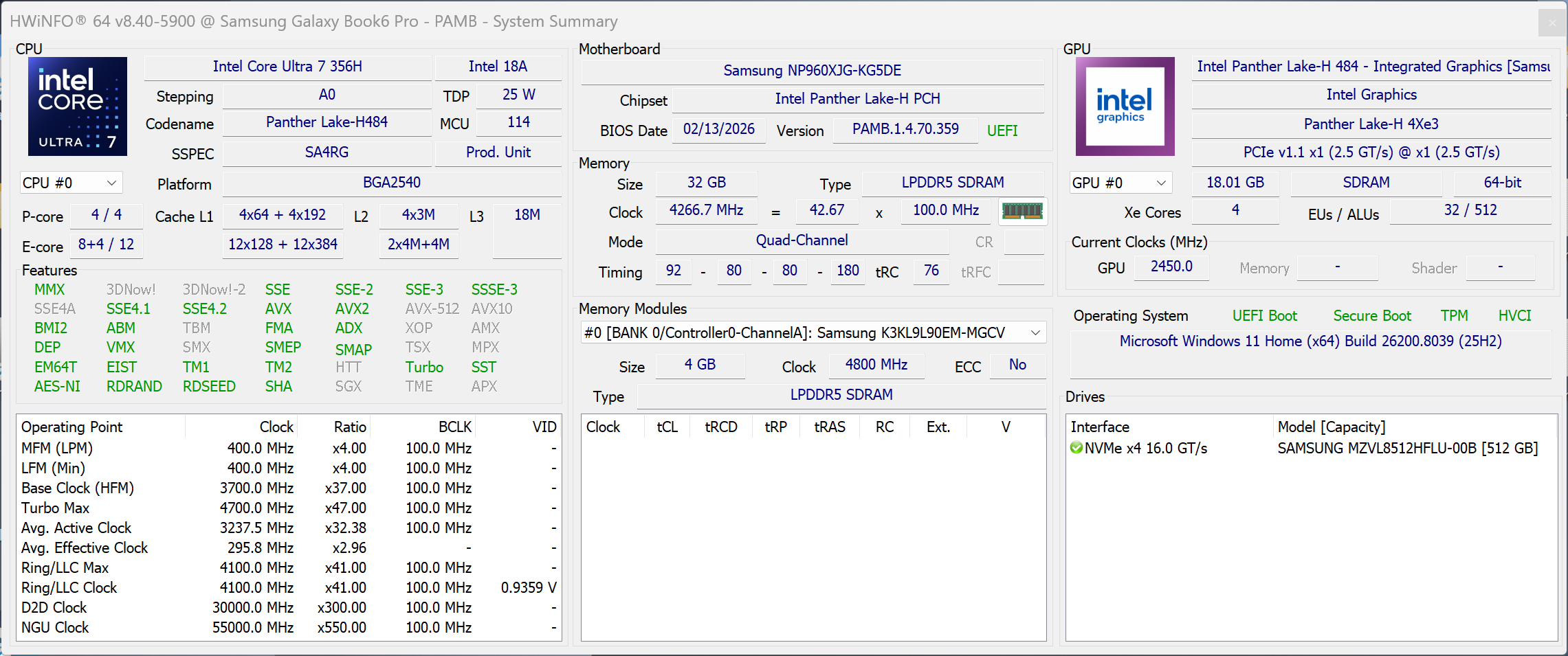 | Samsung Galaxy Book6 Pro Intel Core Ultra 7 356H ⎘ Intel Graphics 4 Xe3 Panther Lake iGPU ⎘ 32 GB Memory, 512 GB SSD | Amazon: List Price: 2199€ | 1.6 kg | 11.9 mm | 16.00" 2880x1800 212 PPI OLED | |