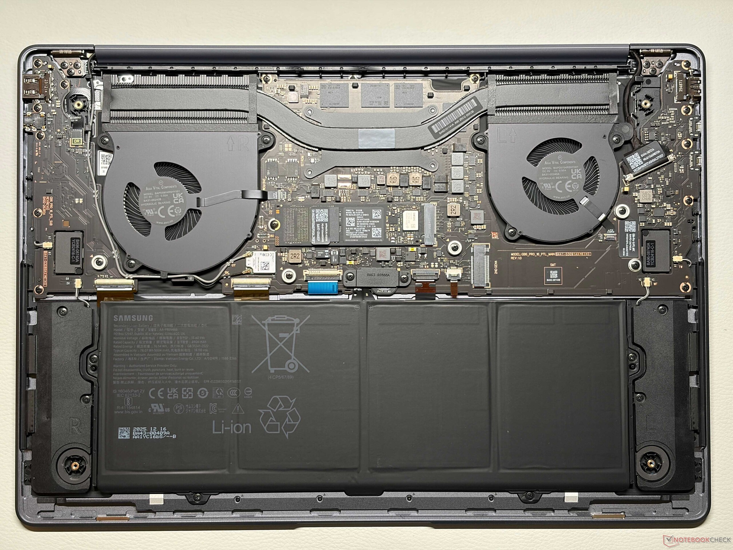 The chassis design looks pretty much identical to the previous model, which means you once again get a sleek 16-inch laptop with a high-quality aluminum chassis. The silver color does not really attract fingerprints and the stability is excellent. Especially the lower bezel is once again very thick and the new keyboard design as well as the re-arranged Samsung logo on the lid are basically the only two visible changes. The internal layout was slightly changed as well, but you still get two full-size M.2-2280 SSD slots, all the other components are onboard.