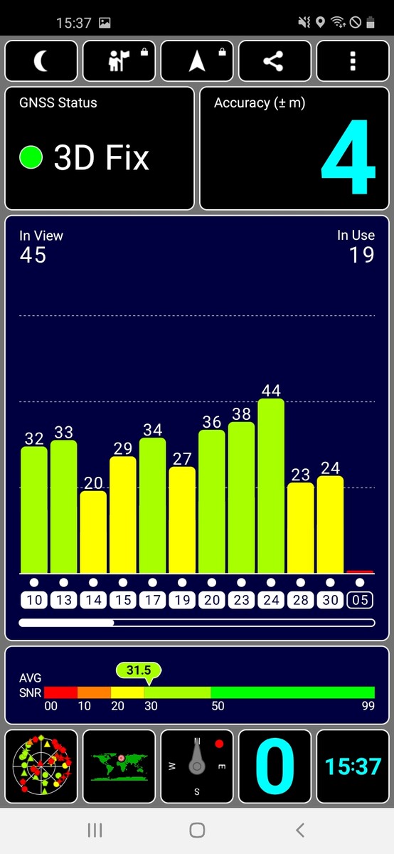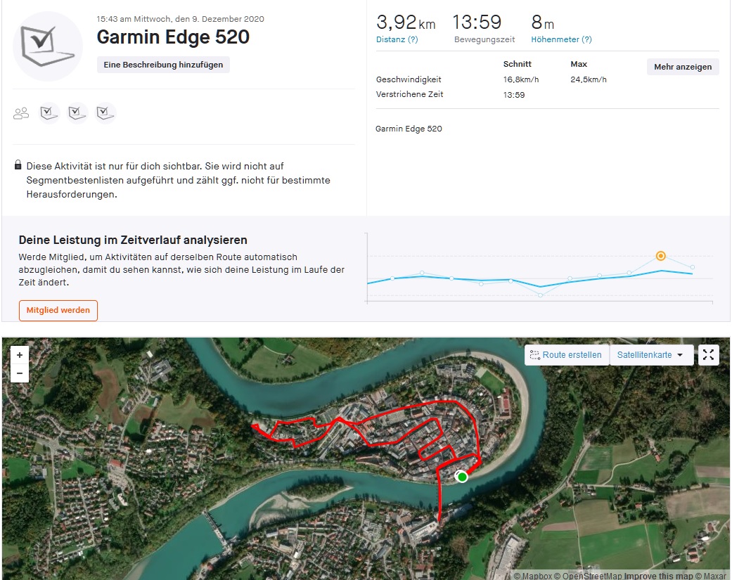 The Galaxy M11 uses the GPS, GLONASS, Galileo and Beidou satellite networks for positioning. To assess the positioning accuracy of our review sample in practice, we recorded a route with the Garmin Edge 520 for comparison purposes. The detailed GPS recording shows a very appealing route accuracy for this price range, so only minor deviations between the smartphone GPS module and the navigation device occur at the end of the 4-kilometer (2.5 mi) test route. The provided positioning level is completely sufficient for everyday navigation tasks.