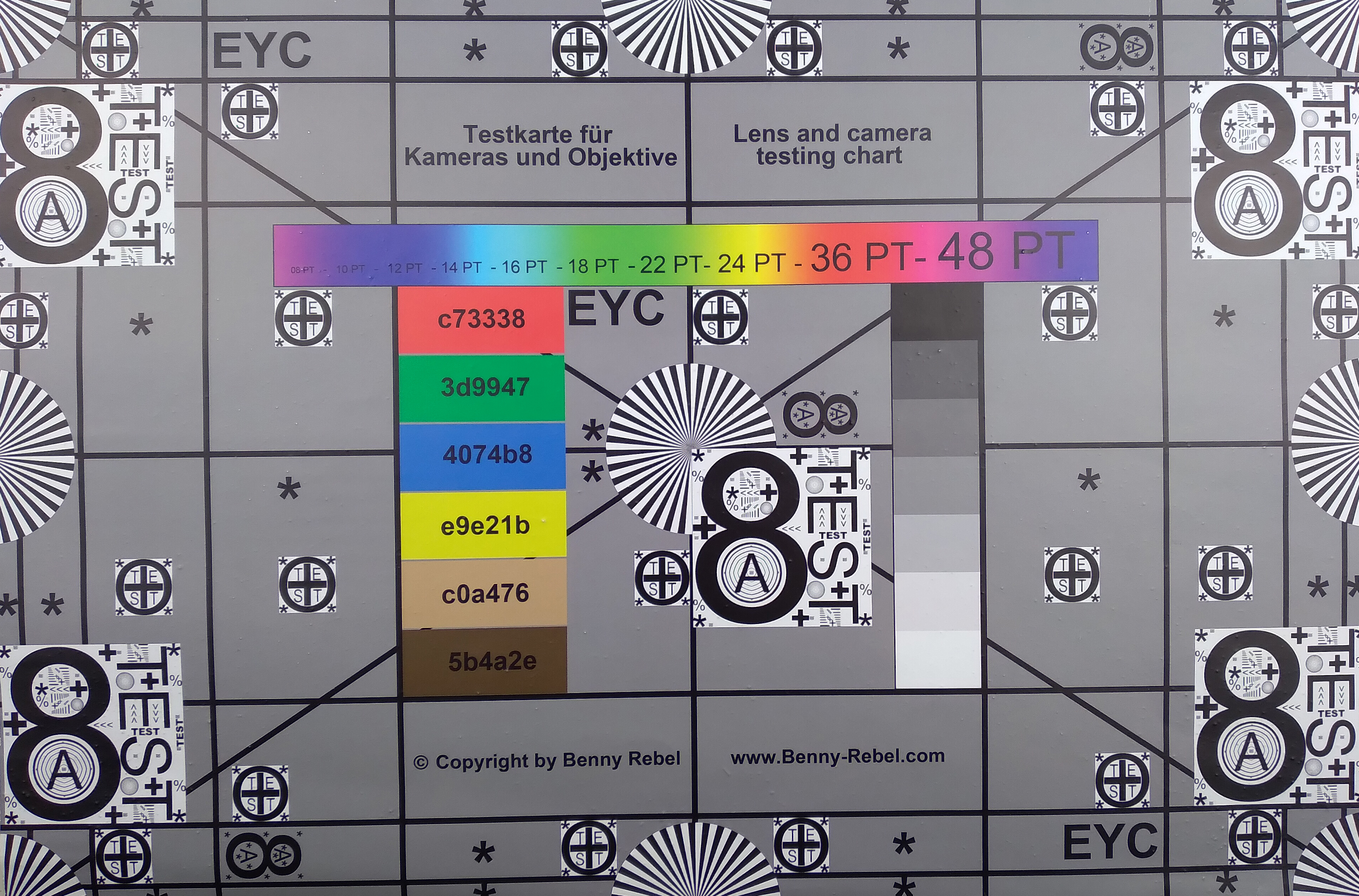 In order to assess the sharpness of the photos, we shoot our test chart under defined artificial light. As in the test shots, the image sharpness is on a low level, but the peripheral areas only fall off marginally.
