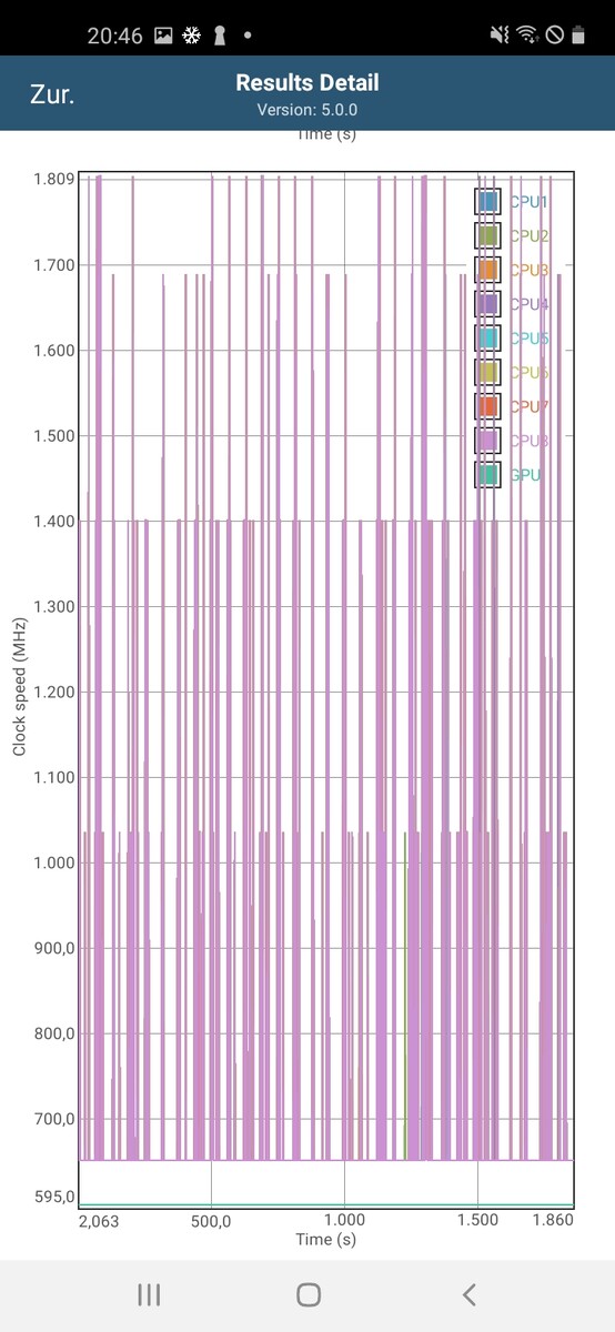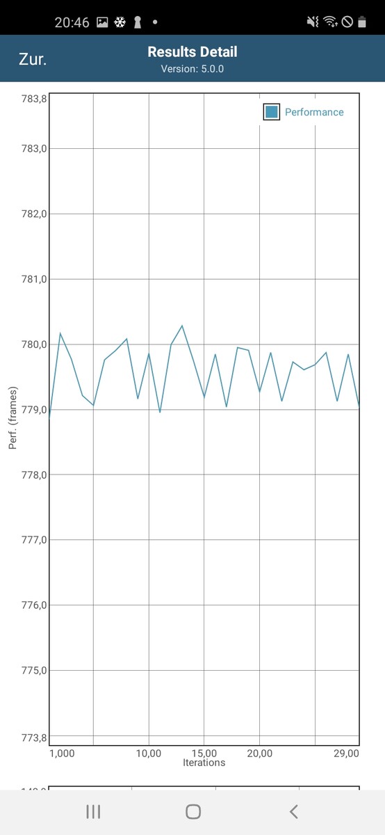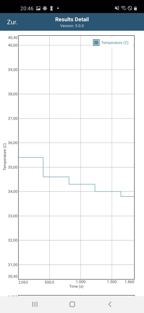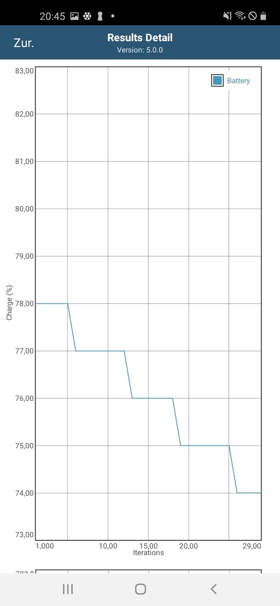 We also analyze the temperature behavior of the Qualcomm SoC under continuous load with the battery test of the app GFXBench. The respective scenarios are run thirty times in succession and various parameters are logged.
