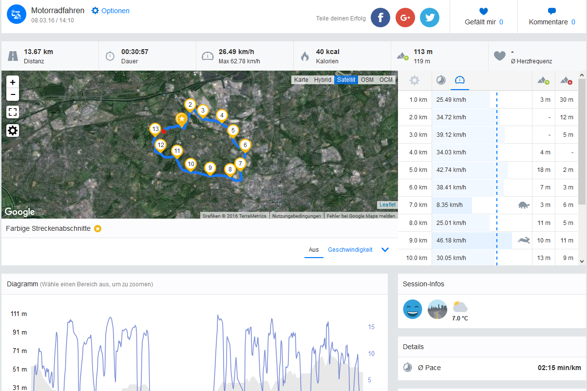 You can locate the Galaxy S7 via GPS, GLONASS and BeiDou. We got a signal inside the apartment for a short while, but the accuracy was rather poor in this case. The accuracy was already down to 8 meters (~26 ft) when we were close to a window, and improved by another 2 meters (~6.5 ft) outdoors. We also used the Galaxy S7 for a car ride and compared the results with the professional navigation device Garmin Edge 500. The performance of the smartphone is excellent in general, and the overall track length difference was only 5 meters (~16 ft). There are small shortcuts in difficult situations, where the smartphone does not locate the position quite as often. However, the professional navigation device also has some issues and shows that we drove through the grass strip (third screenshot). There should be no problems when you use the Galaxy S7 for navigation in the car or on a bike.