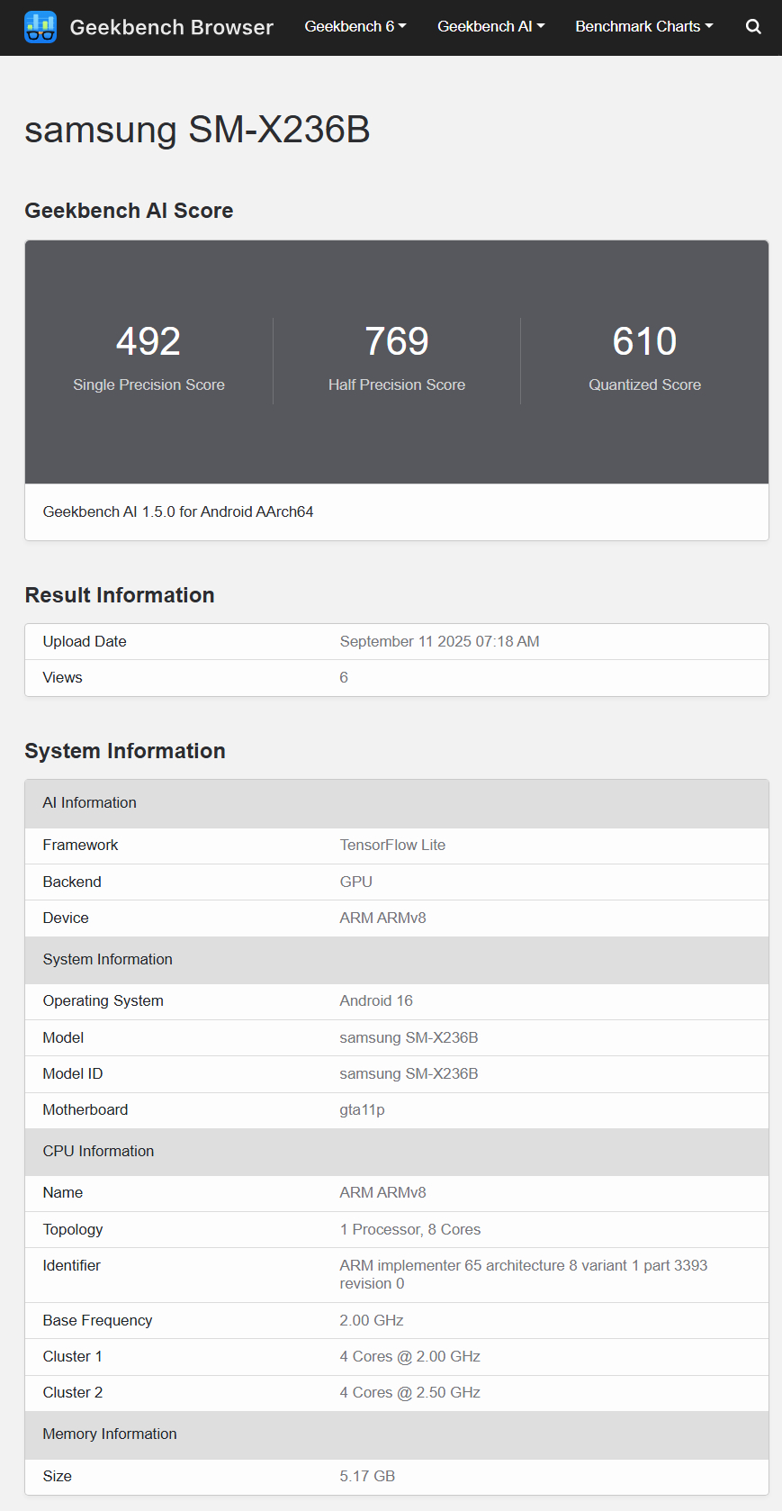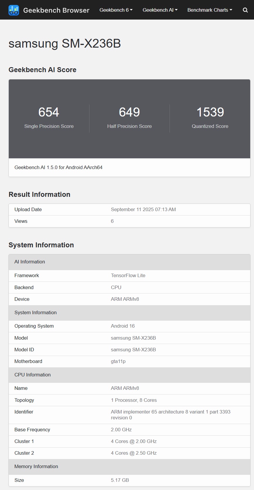 Now, the alleged Galaxy Tab A11 Plus has turned up on the same benchmarking platform in two listings. Benchmarked as the SM-X236B with the motherboard 'GTA11P', the tablet contains an octa-core chipset split into two equal clusters. While that description applies to many mobile chipsets, 'ARM implementer 65 architecture 8 variant 1 part 3393 revision 0' identifies the chipset as the Dimensity 7300 or Dimensity 7300X, also found inside devices like the Motorola Razr 50 and Poco X7.