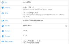 As far as the internal hardware is concerned, the benchmark lists specs such as an octa-core Exynos 5 processor, 3GB of RAM, 32GB of integrated storage space, a 7MP rear camera, and a 2MP secondary sensor. On the software side, the Samsung Galaxy Tab S2 9.7 is listed as running Android 5.0.2 Lollipop, most likely overlaid with a new version of Samsung's Touchwiz interface.