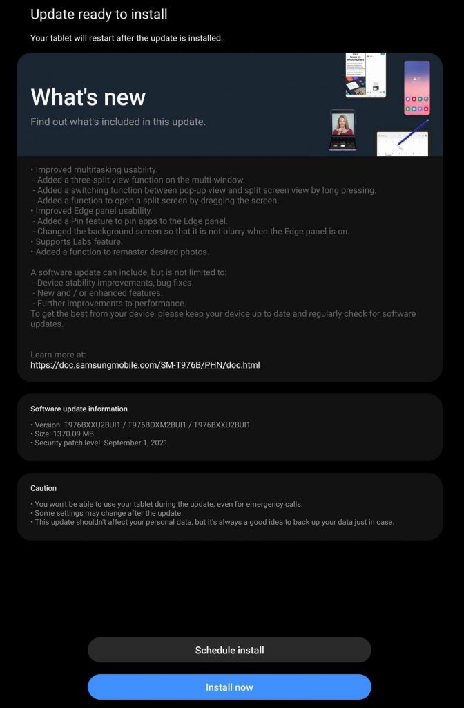 Moreover, One UI 3.1.1 adds a triple split view function as part of a multitasking overhaul. Previously, One UI could only display two apps side-by-side, despite the size of the Galaxy Tab S7 series' displays. One UI 3.1.1 also allows you to switch between pop-up view and split-screen view, while the latter can now be activated by dragging the screen. As Samsung notes in its release notes, it is a good idea to backup your data before installing T976BXXU2BUI1; One UI 3.1.1 should not affect your data, though.