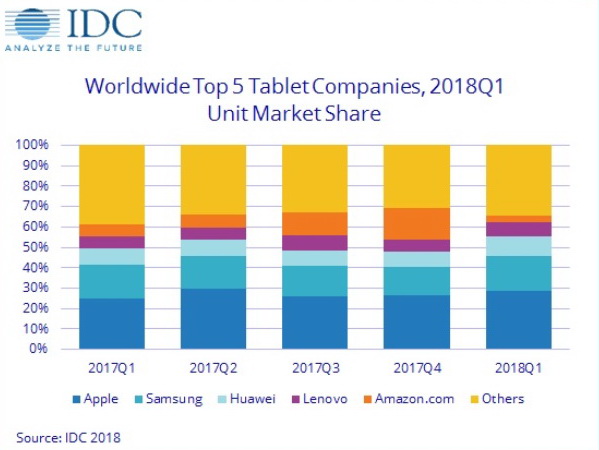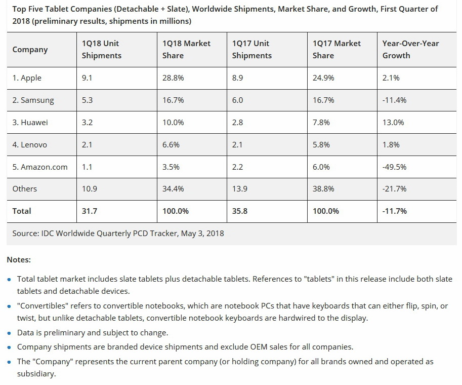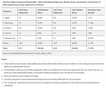 It's well known by now that the tablet market has been on the decline. Now, the latest preliminary quarterly figures from market analytical firm IDC paint a similar picture - if not worse. According to the firm, global shipments of tablets and detachables as of Q1 2018 have dropped 11.7 percent YoY from 35.8 million to 31.7 million. The hardest hit are Samsung and Amazon who managed to ship 11.4 percent and 49.5 percent fewer tablets YoY, respectively.