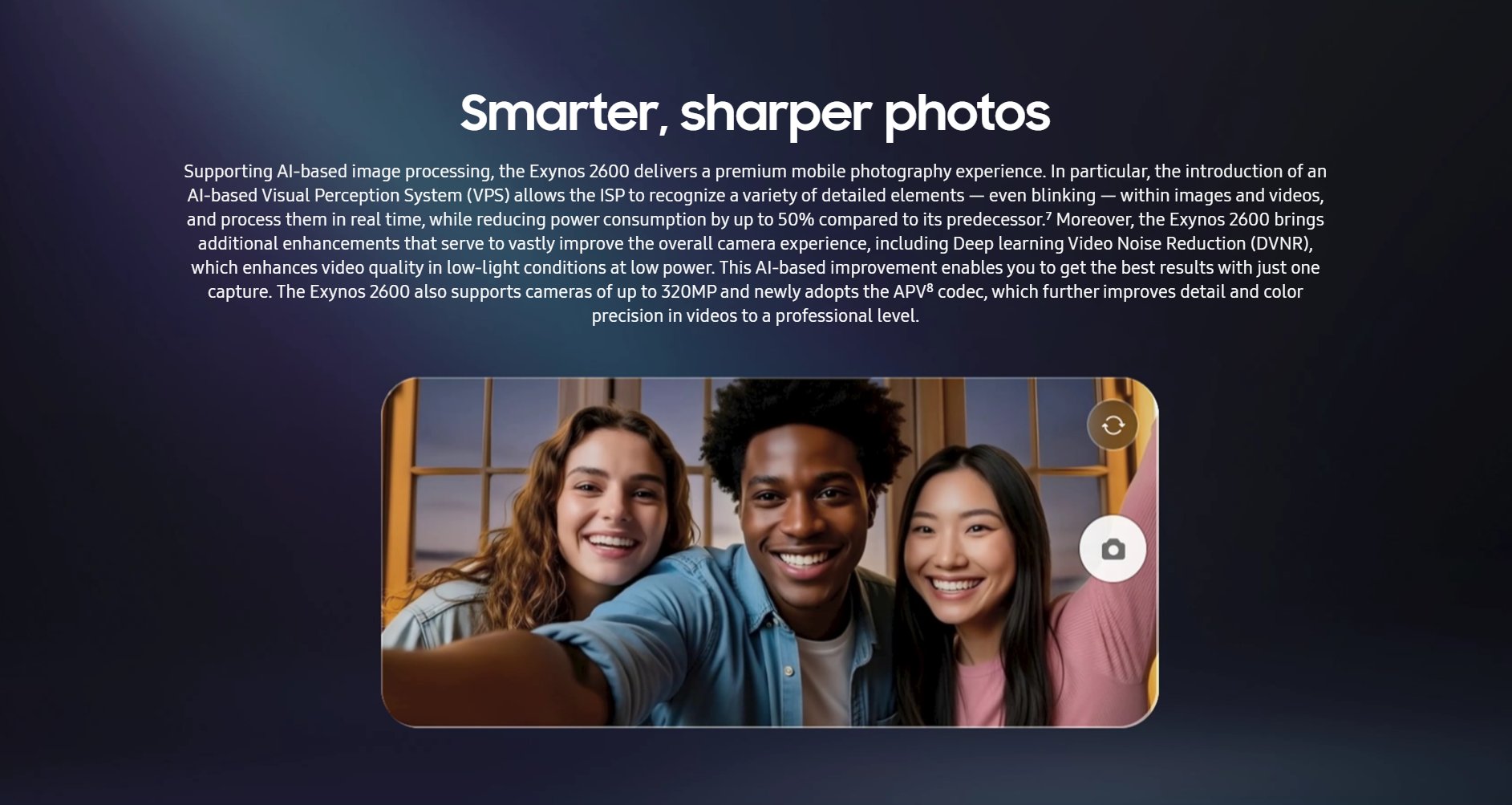 Samsung also showcased a new AI-based Visual Perception System (VPS) in the integrated image signal processor (ISP). This VPS can recognise scenarios such as a subject blinking during a selfie. Another notable addition is a noise-reduction system designed to enhance low-light camera performance. Even with all these upgrades, the new ISP consumes 50% less power than its predecessor in the Exynos 2500. With AVP codec support, Samsung aims to establish an alternative to Apple’s ProRes for professional video recording. The Exynos 2600 also supports cameras with resolutions of up to 320 MP.