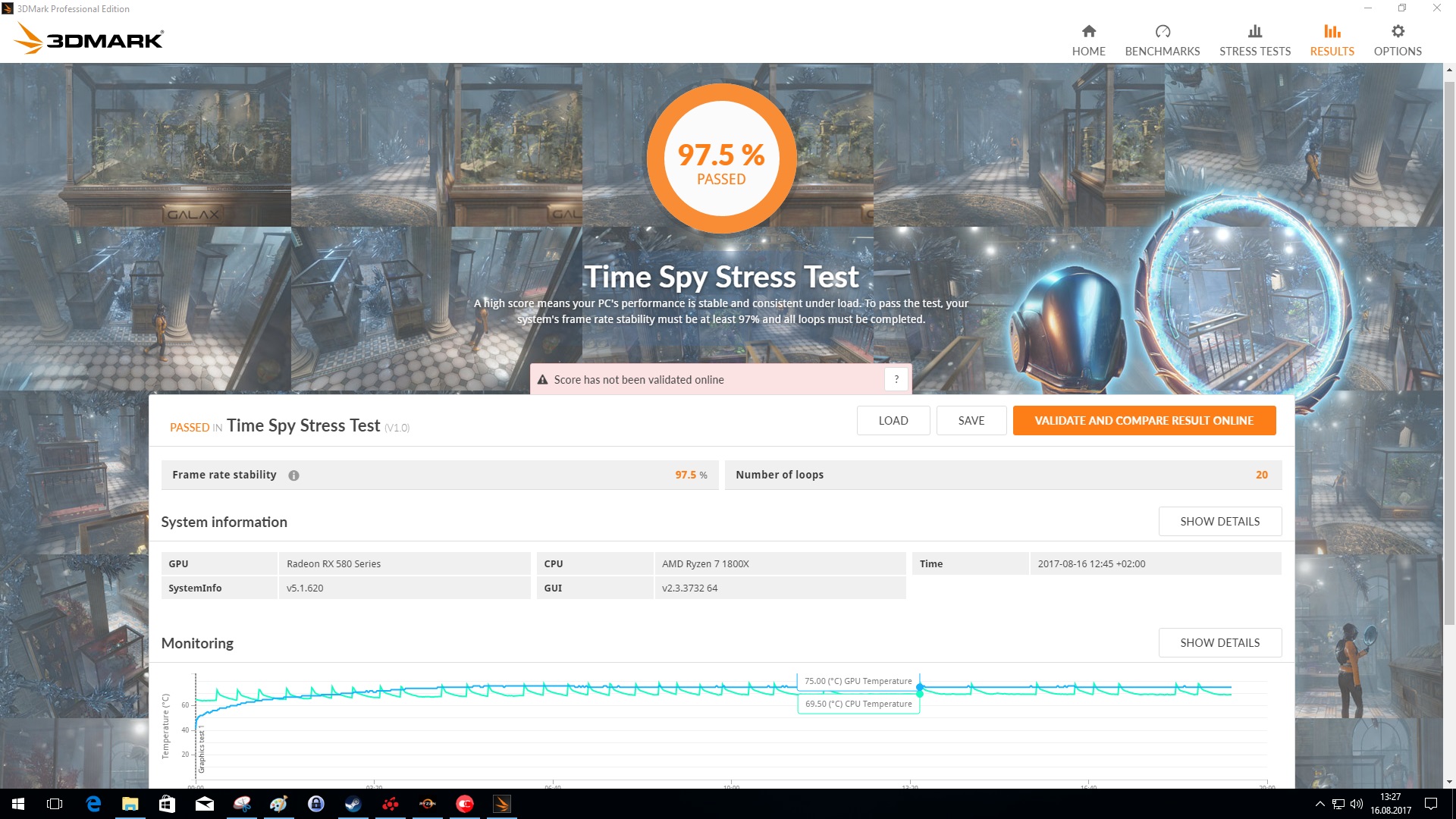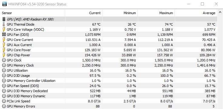 Under constant load, the Sapphire Nitro+ Radeon RX 580 can continue to use its full potential. The stress tests we ran (Sky Diver and Time Spy) show this with a result of about 97%. In the one-hour load test with FurMark, the 76 °C (169 °F) temperature is reached after 10 minutes. After that, the temperature levels out at 75 °C (167 °F). The two 95-mm axial fans spin at a conservative 850 rpm on average. With that, the operation of the graphics card is comfortably quiet even under load. The two fans produce a quiet rather than a high-frequency whirring. The clock speed of 1,411 MHz is maintained throughout. However, we can already guess that the overclocking potential might be limited slightly. The speed of the fans is only slowly increased when the temperature exceeds the limit of 76 °C (169 °F). Of course, these settings can also be adjusted manually with various tools. The WattMan tool included in the graphics driver offers many adjustment options and at the same time a good monitoring overview. If we adjust the fan speed to 1,100 rpm, the noise level only increases minimally, but the temperature of the graphics card decreases quickly to 70 °C (158 °F). If we set the fan speed to "Auto" again, both fans spin again at about 850 rpm and the temperature rises again to 75 °C (167 °F).