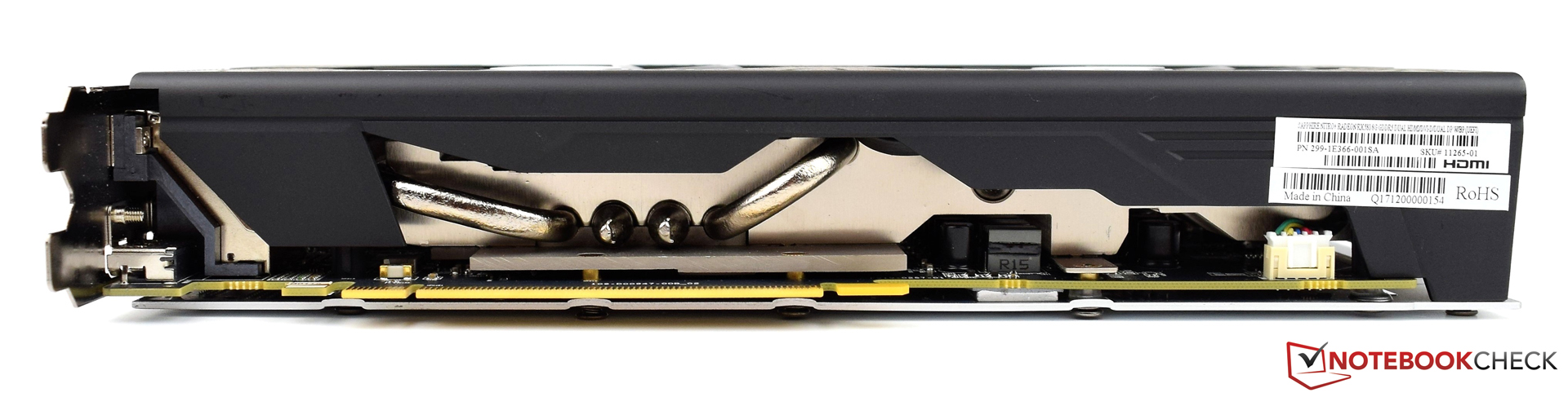 Visually, our test unit clearly differs from the reference design, which also shows in the dimensions. With a length of about 26 cm (~10.2 in) and a height of about 13.5 cm (~5.3 in), you should check before the purchase whether the case offers enough space for this. Even though the graphics card takes two slots, in order to avoid impeding the cooling unit, we advise against inserting another component into the adjacent PCIe slot.