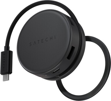 As suggested by its name, the Satechi OntheGo 7-in-1 USB-C Hub is a compact USB-C hub for mobile use, boasting a few unique features. One of these is its rather unusual design. The seven ports are arranged around the perimeter of the round device.