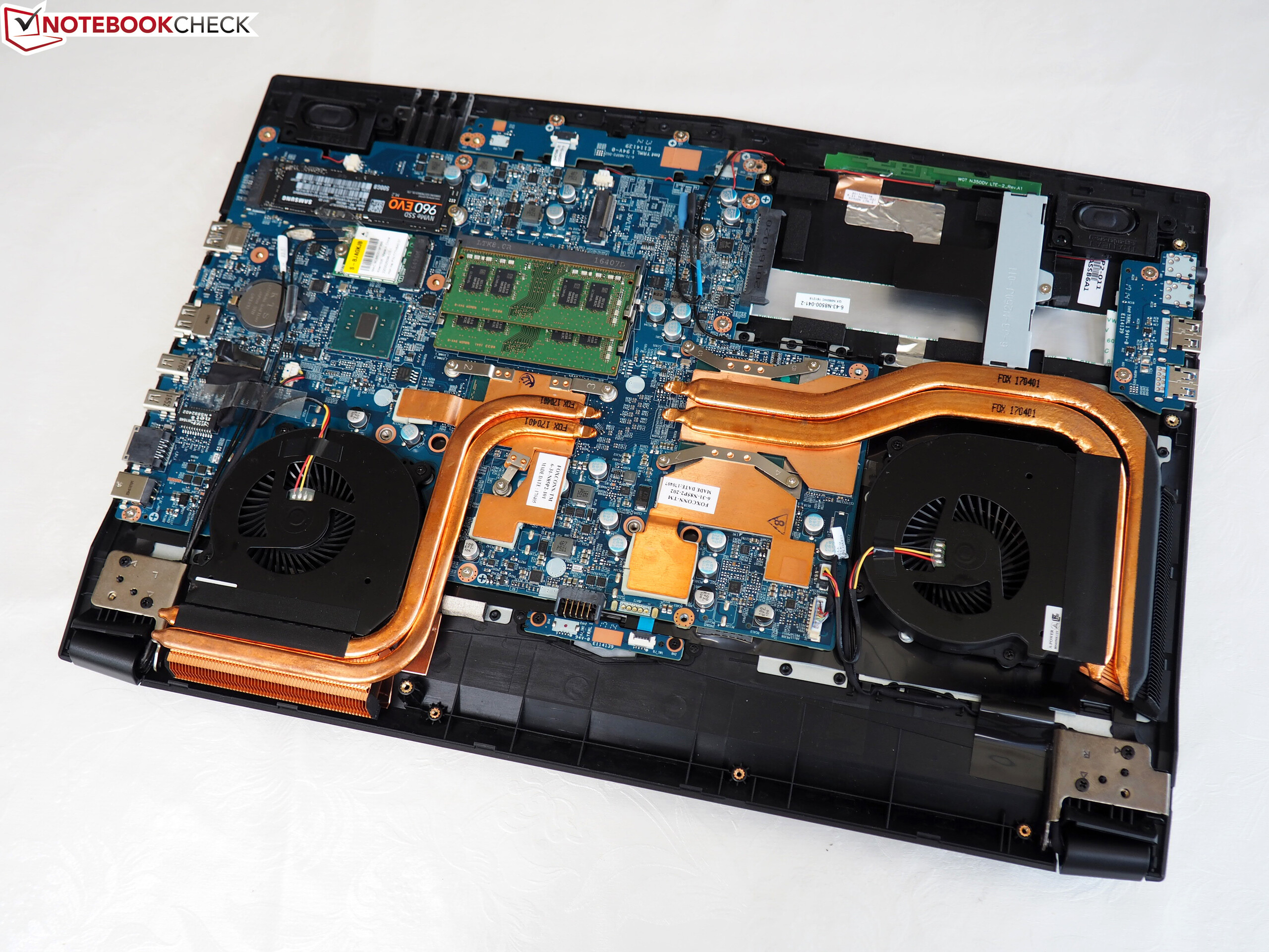 As with most Clevo Barebones, the case can be opened almost completely. Although it takes a little time to take off the bottom of the base unit (12 screws directly on the bottom cover, 4 beneath the battery), the entire inner workings are accessible afterwards. This includes the RAM slots, the drive bays, the speakers and wireless adapter. The cooling systems for CPU and GPU (both soldered onto the motherboard) have been conveniently separated. Both the Core i7-7700HQ and the GeForce GTX 1060 are each connected to two heat pipes and one cooling fan. The keyboard can also be unscrewed, although there are no further components underneath it.