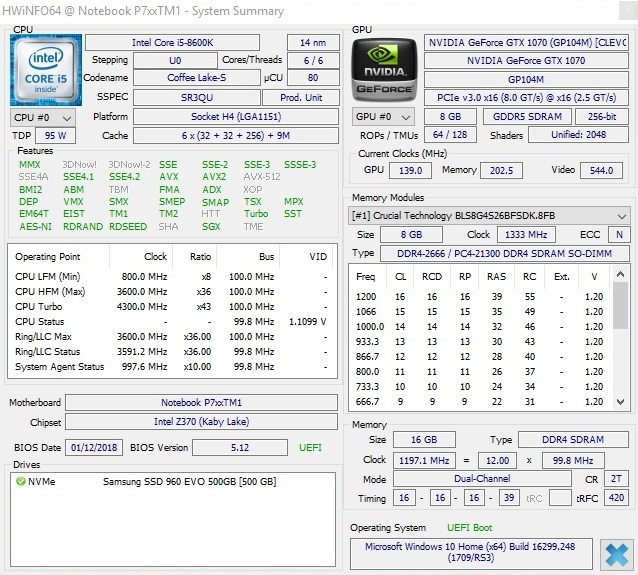 | Average Intel Core i5-8600K, NVIDIA GeForce GTX 1070 Mobile (n=1) | |