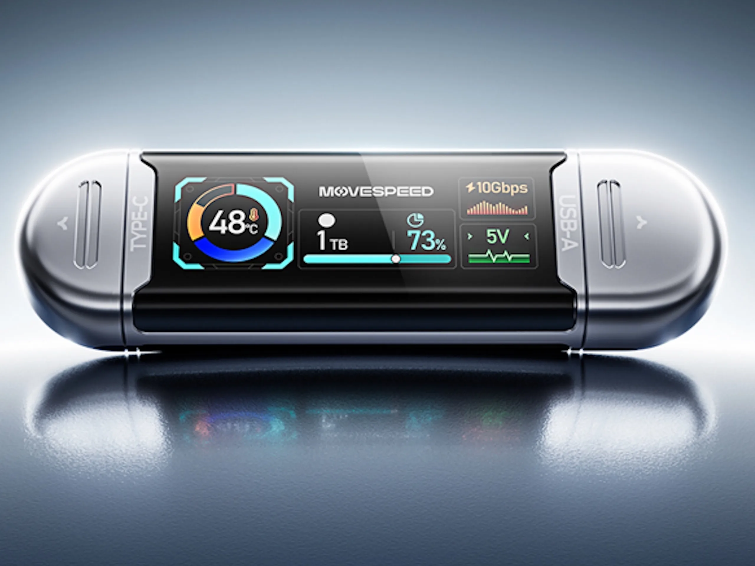 Movespeed’s See U USB Drive, also known as the SU10, is available with five levels of storage: 128GB, 256GB, 512GB, 1TB and 2TB. Each version features USB-C and USB-A 3.2 Gen 2.1 ports, with protective caps, and a central display. On the 1.65-inch (~42 mm) TFT screen, users can view various data points, including the current temperature, capacity and data transfer rate. According to the campaign page, the display has an average brightness of 350 nits and a 170° viewing angle.