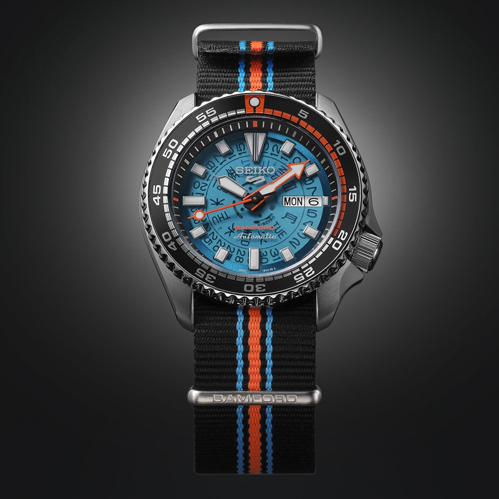 This limited edition model references the archive Seiko 5 Sports "SKX" range, and it sports a "Retro Future" theme throughout its design. The skeletonized dial has multiple bright (and unconventional) Bamford-inspired cues, most notably a teal dial accented by bold orange, blue, and white elements on both the face and the nylon strap. The hands, indexes, and bezel are treated with LumiBrite. There's a Bamford logo at the 6 o’clock position, on the case back, and the custom metal loop of the strap. The watch has a see-through case back with individual serial numbers.