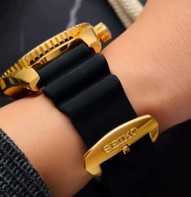 One of the bigger talking points from the original reveal was the packaging. Seiko Thailand ships the Muay Thai Limited Edition in a special box with the watch on a gold-tone bracelet, plus an extra black rubber strap and a matching gold buckle. The hands-on clip focuses on that second option. On wrist, the rubber strap tones down the overall look a bit, making the watch feel more like a daily-wear diver with a flashy case instead of full wrist jewelry. The strap tapers slightly towards the signed gold buckle, which is engraved with the Seiko logo.