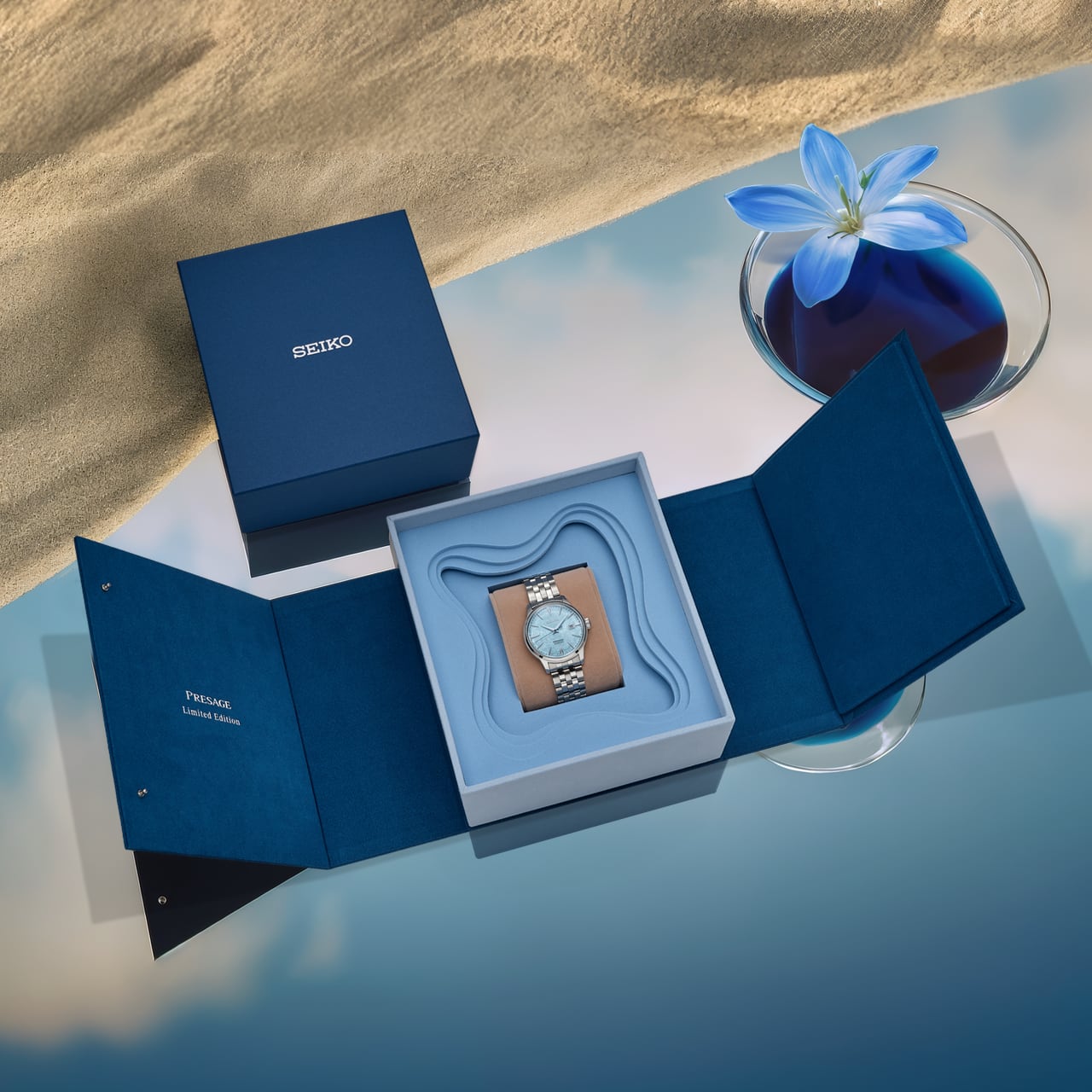 The Presage Cocktail Time Maya Bay Limited Edition has a silver-tone stainless steel casing, with a 40.5 mm (~1.6 inch) diameter and 11.8 mm (~0.5 inch) depth. This surrounds a light blue dial with a sparkling effect, mimicking the waters in Maya Bay. The watch comes with a matching stainless steel strap, fastening with a safety clasp.