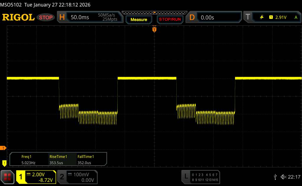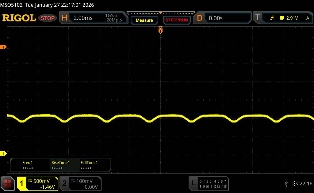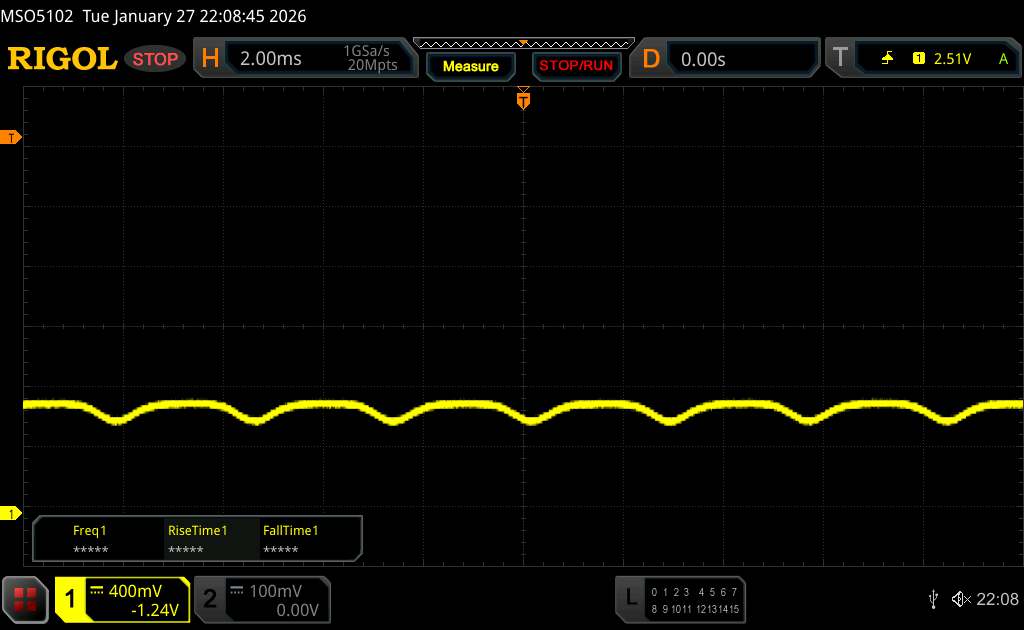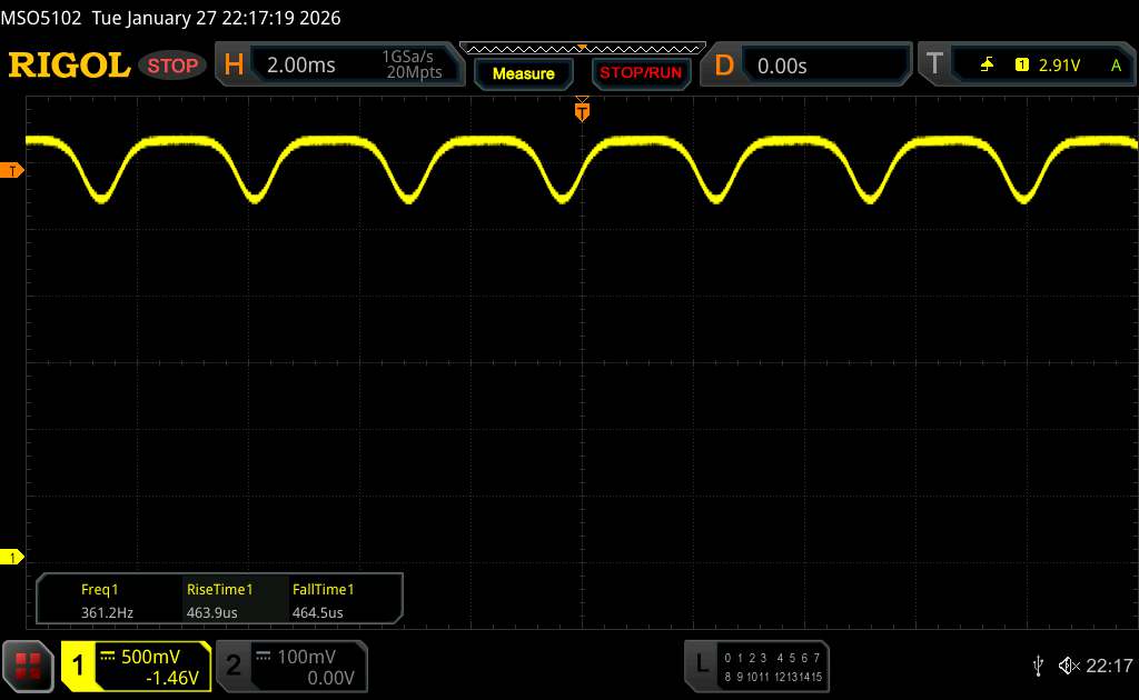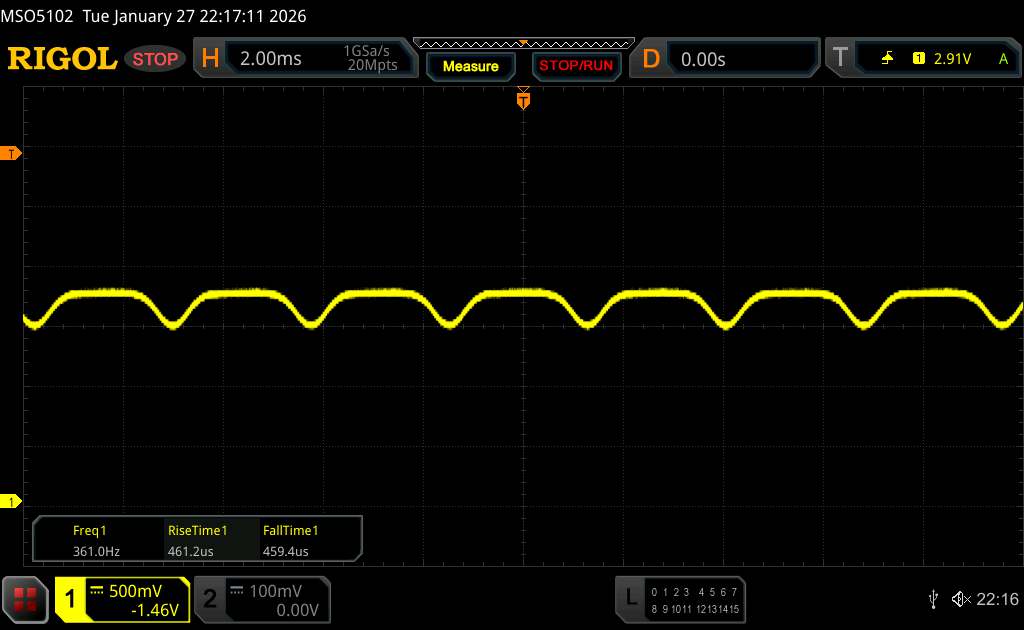 Using the oscilloscope, we measured a base frequency of 360 Hz. However, high-frequency PWM dimming of more than 1,500 Hz is also used, so any health effects for sensitive users should remain limited.