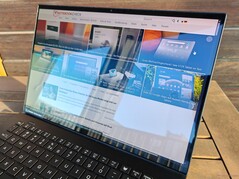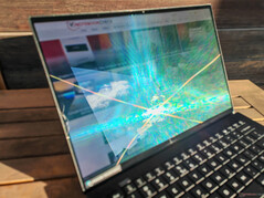 Acer uses a 14.5-inch OLED touchscreen (2,880 x 1,800 pixels, 16:10) with 120 Hz from Samsung. The basic OLED strengths (vivid colors, high contrasts, fast response times) are present, but the touchscreen layer results in a clearly visible raster effect, which greatly impairs the subjective image quality, especially with bright content. We tried to capture this in the picture on the right, but the camera exacerbates the problem minimally. There is also PWM flickering at 240 Hz at every brightness level. Both the brightness and the color temperature can be controlled by a sensor. The touchscreen is very reflective, which limits its use, especially outdoors.