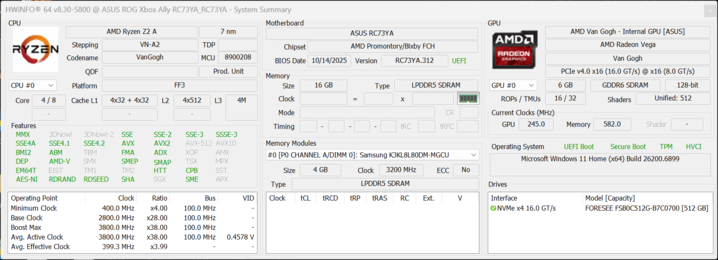 The Ryzen Z2 A is based on the older Zen 2 architecture and is paired with 16 GB of RAM in the Xbox Ally. On our test device, 6 GB of this memory was assigned to the integrated RDNA 2 GPU by default, although this can be adjusted in the Armoury Crate SE software.