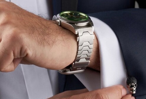 The band is available in three versions: stainless steel in silver or black, or titanium in gray. A barely visible quick-release clasp on the top link allows the band to be opened with a single movement. The length can be adjusted by removing or adding links using the included tool. Weighing between 60 and 100 grams, depending on the material and length, the band is quite heavy and the weight increases further when two watches are attached. The second watch can be replaced with a conventional clasp if desired.