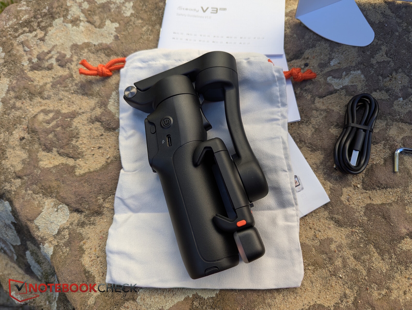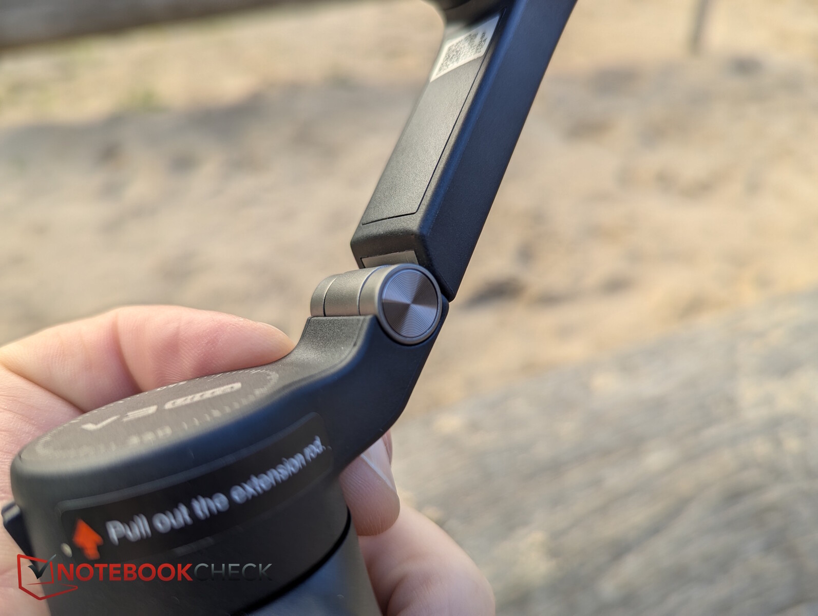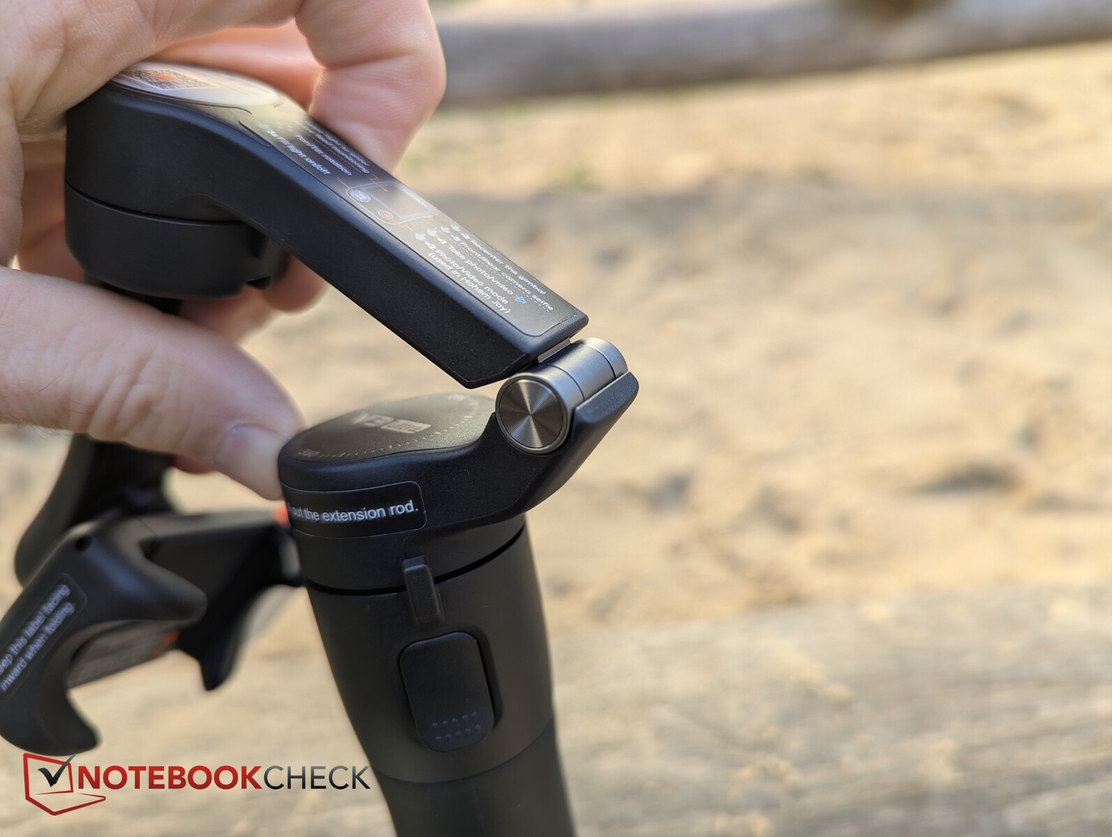 When folded, the gimbal is pleasantly compact — though at just over 400 g, not exactly light. The plastic housing feels sturdy and solid, partly thanks to that weight.