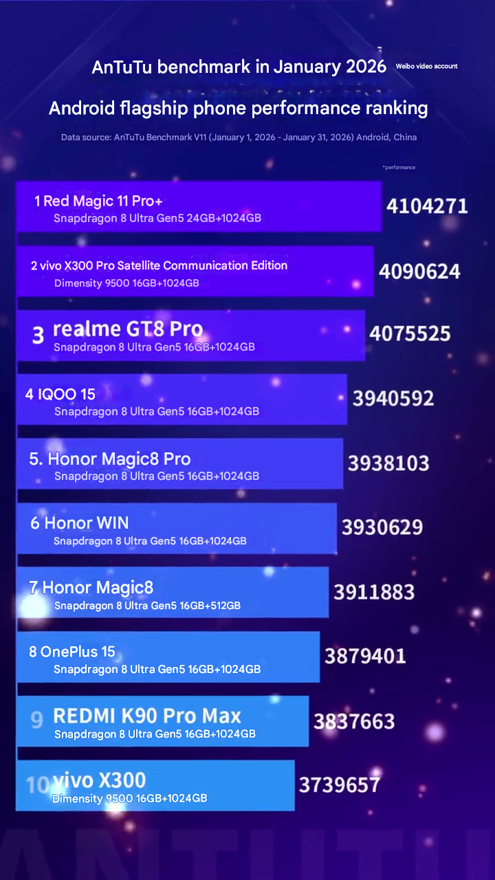 The first flagship performance rankings of 2026 from AnTuTu are here, and not much has changed from the last list. Just as in the December 2025 chart, the Snapdragon 8 Elite Gen 5 has dominated the latest list, with only two of the ten smartphones powered by the Dimensity 9500.