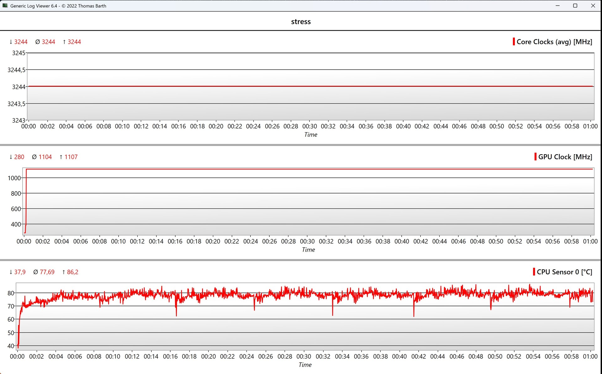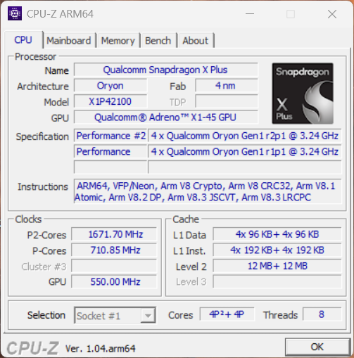 The Qualcomm Snapdragon X1P-42-100 offers 8 cores with a maximum clock speed of 3.4 GHz. However, the X1P-42-100 does not support the CPU boost of the more expensive models. The power consumption of the Snapdragon processors can still not be read out. However, based on our consumption measurements, the CPU should consume around 35 watts (later 30 watts). The combined CPU/GPU load leads to ~40-45 watts of power consumption.