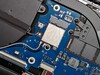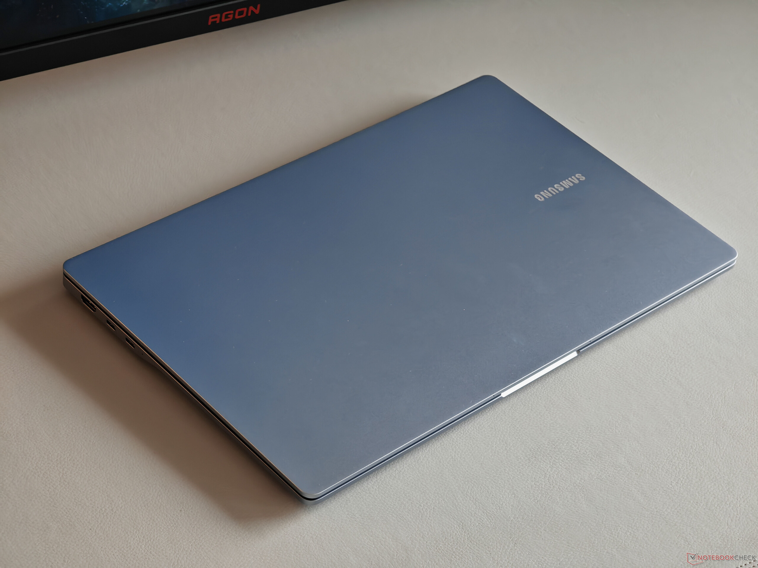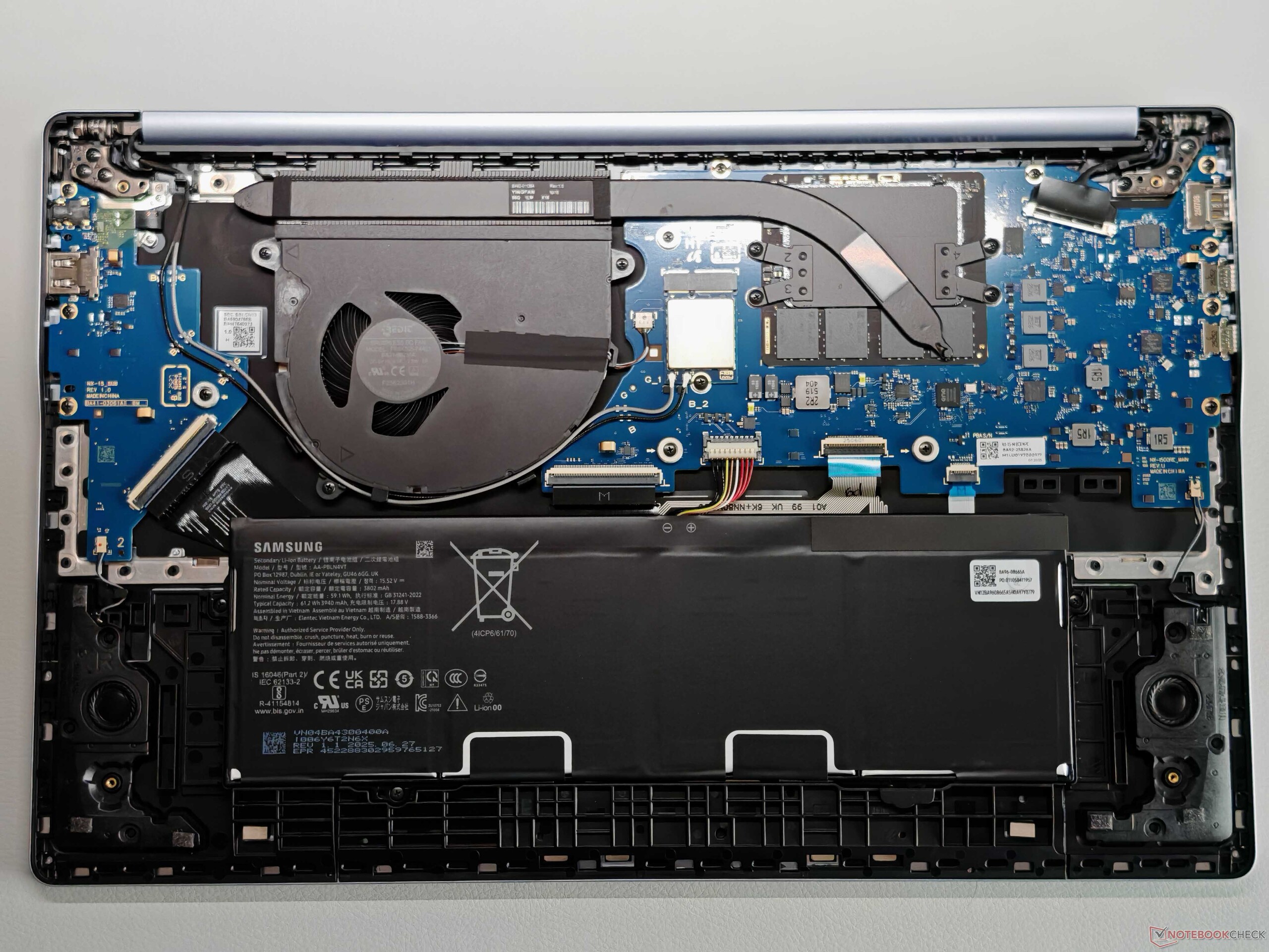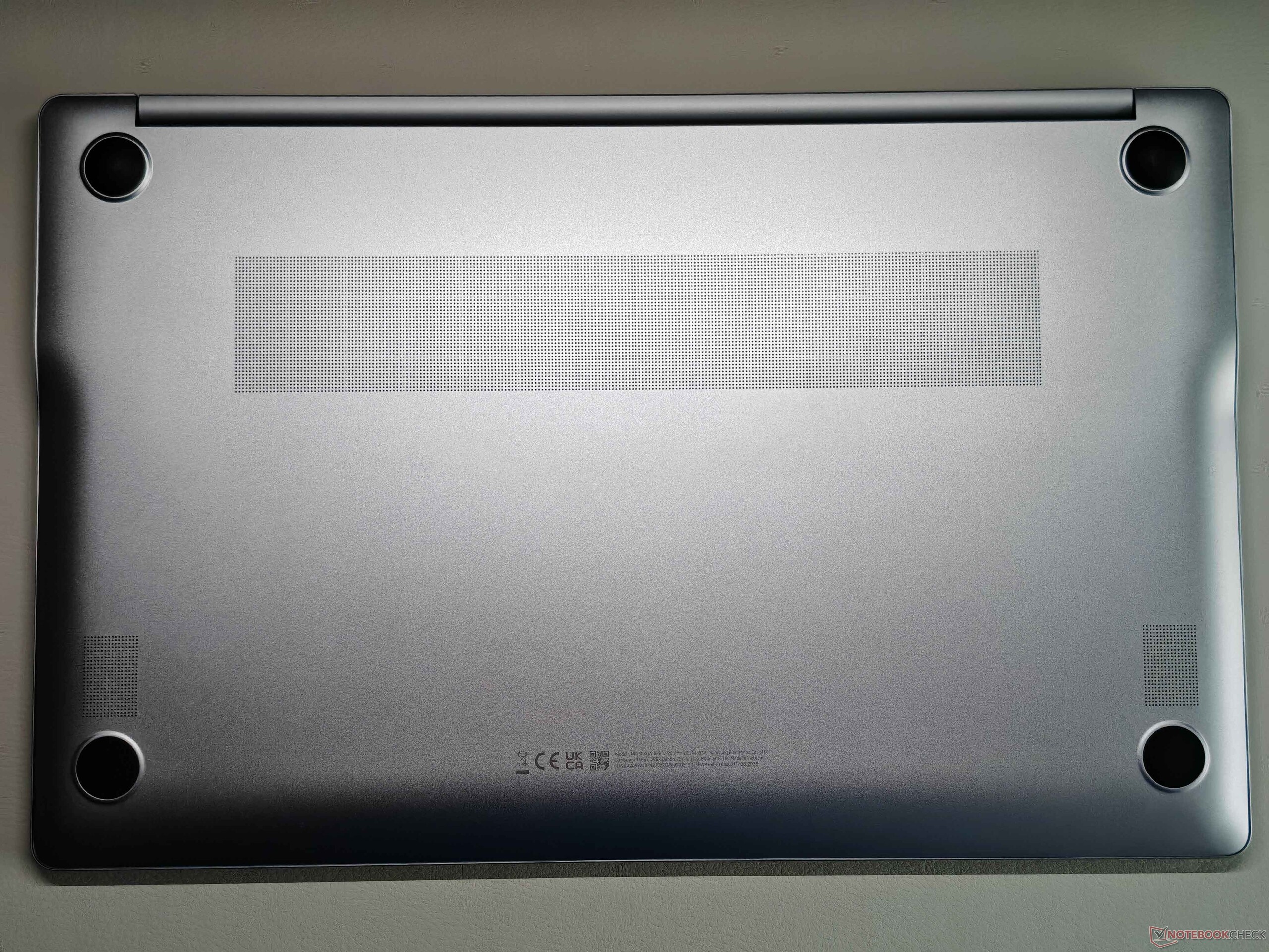 Samsung uses a slim metal case for the Galaxy Book4 Edge, which is 1.5 cm thick and weighs 1.49 kg, making it easy to fit into any backpack. The case color is Sapphire Blue, which is a very light shade of blue (rather silver with a slight blue tint). Visually, the notebook looks great, and the quality is also good. Only the display hinge (max. opening angle 180 degrees) is a little too smooth and, therefore, wobbles a little. The lower case cover can be removed (screws under the rubber feet), but the maintenance options are limited to cleaning the fan, the WLAN module, and the battery, which can be replaced if necessary.