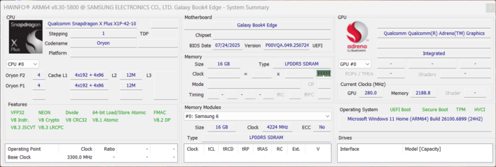 Samsung Galaxy Book4 Edge 15 Qualcomm Snapdragon X Plus X1P-42-100 ⎘ Qualcomm SD X Adreno X1-45 1.7 TFLOPS ⎘ 16 GB Memory, 256 GB | Amazon: 1. $684.90 SAMSUNG 15” Galaxy AI Book... 2. $629.00 SAMSUNG Galaxy Book4 Edge La... 3. $969.99 Samsung Galaxy Book4 AI Busi... List Price: 749€ | 1.5 kg | 15 mm | 15.60" 1920x1080 141 PPI IPS | |