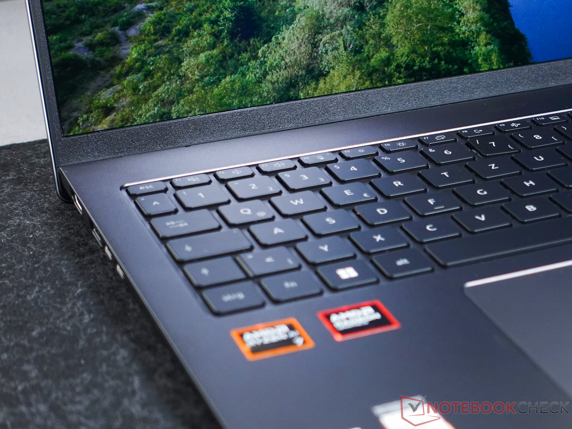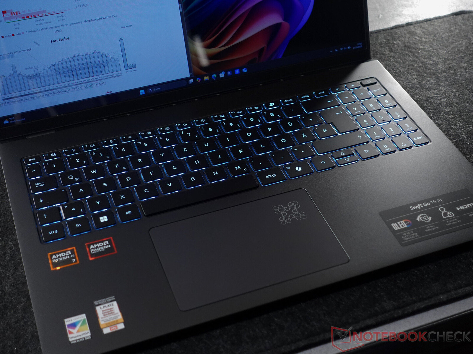 The keyboard of the Swift Go 16 AI offers a complete layout, including a dedicated number block. Backlighting and nice, well-defined pressure points are hallmarks of these keys. The generously sized touchpad operates precisely. As a special feature, it signals via subtle lighting effects when the NPU (Neural Processing Unit) of the processor or other AI functions are actively used.
