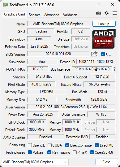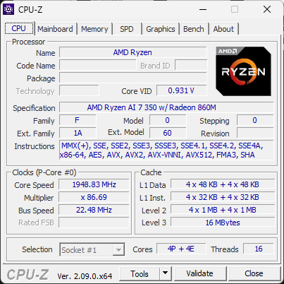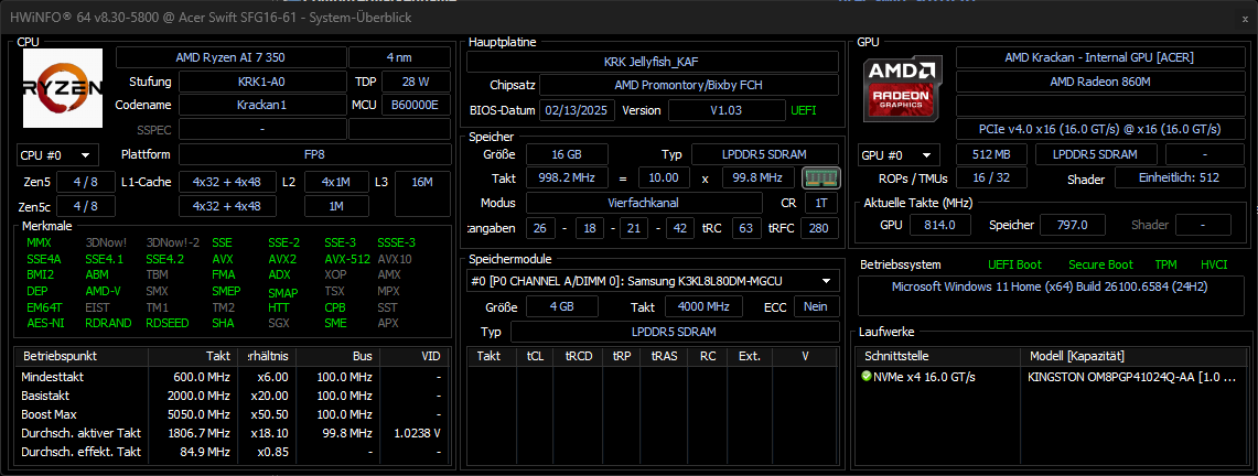 Acer provides a variety of hardware configurations for the Swift Go AI. Our test device is equipped with the AMD Ryzen AI 7 350 processor, accompanied by 16 GB of RAM, which seems somewhat limited considering the powerful processor.