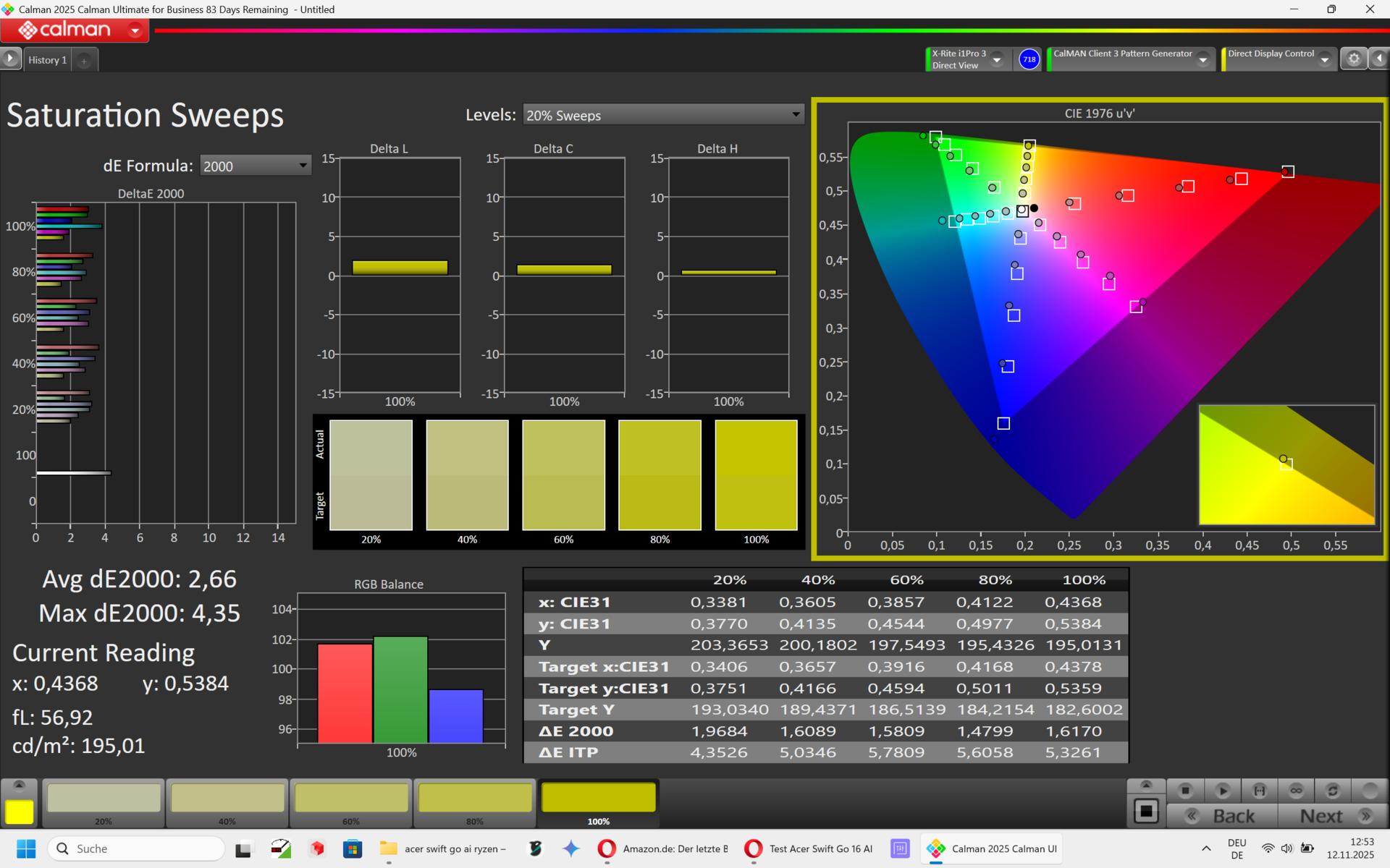 For creatives, color gamut coverage is crucial: The display covers nearly the entire Display P3 color space. The color accuracy out of the box is already remarkably good, requiring little calibration. Flickering during image refreshment is a characteristic of OLED panels. This happens here at a frequency of 220 to 250 Hz.