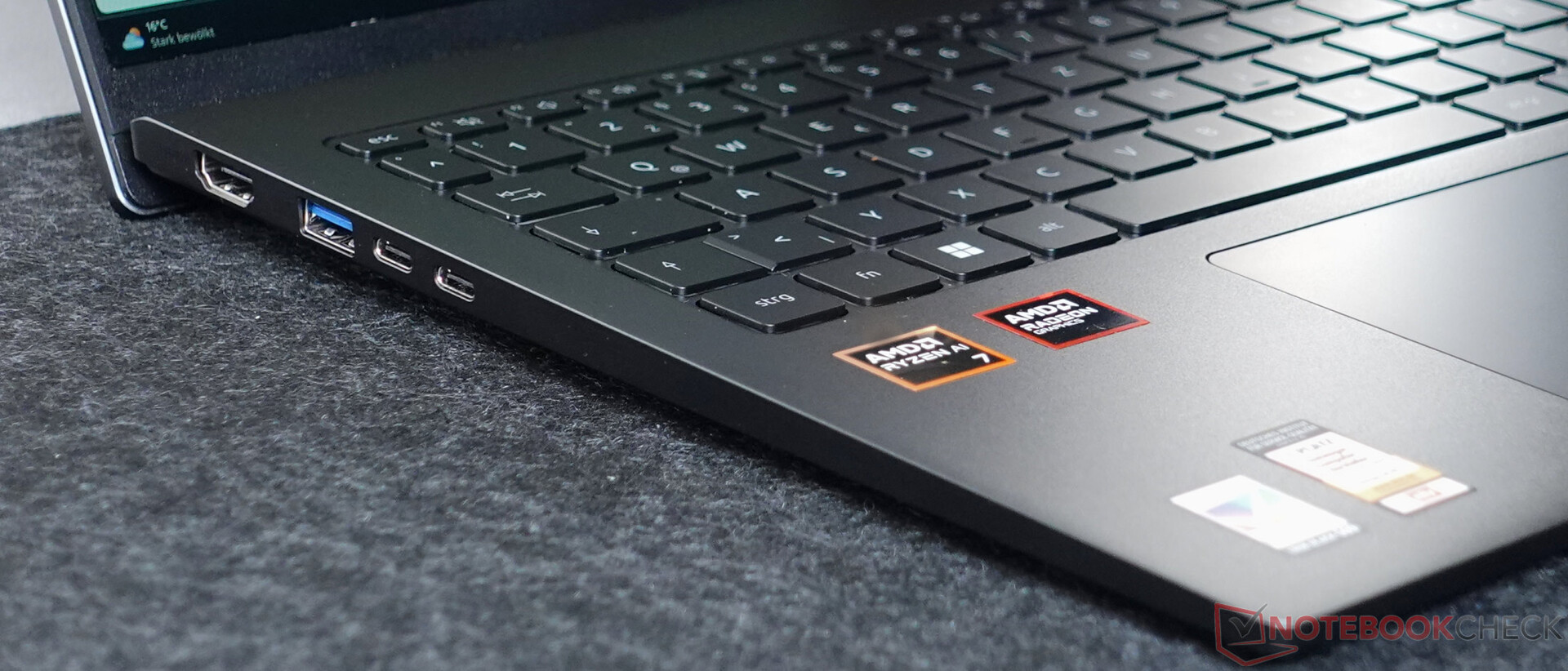 The 2.5K webcam in its small protrusion on the display produces good images. Stable Wi-Fi connectivity is ensured by a MediaTek module with Wi-Fi 7. On the left side of the laptop, most connections are concentrated. Two USB-4 ports are also available here.