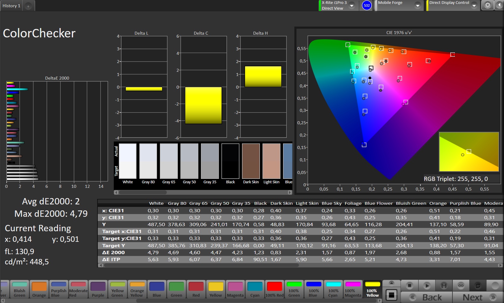 Colorchecker dE 2000 max. * | 4.79 | 5.1 -6% | 5.46 -14% | 4.01 16% | 8.83 -84% |