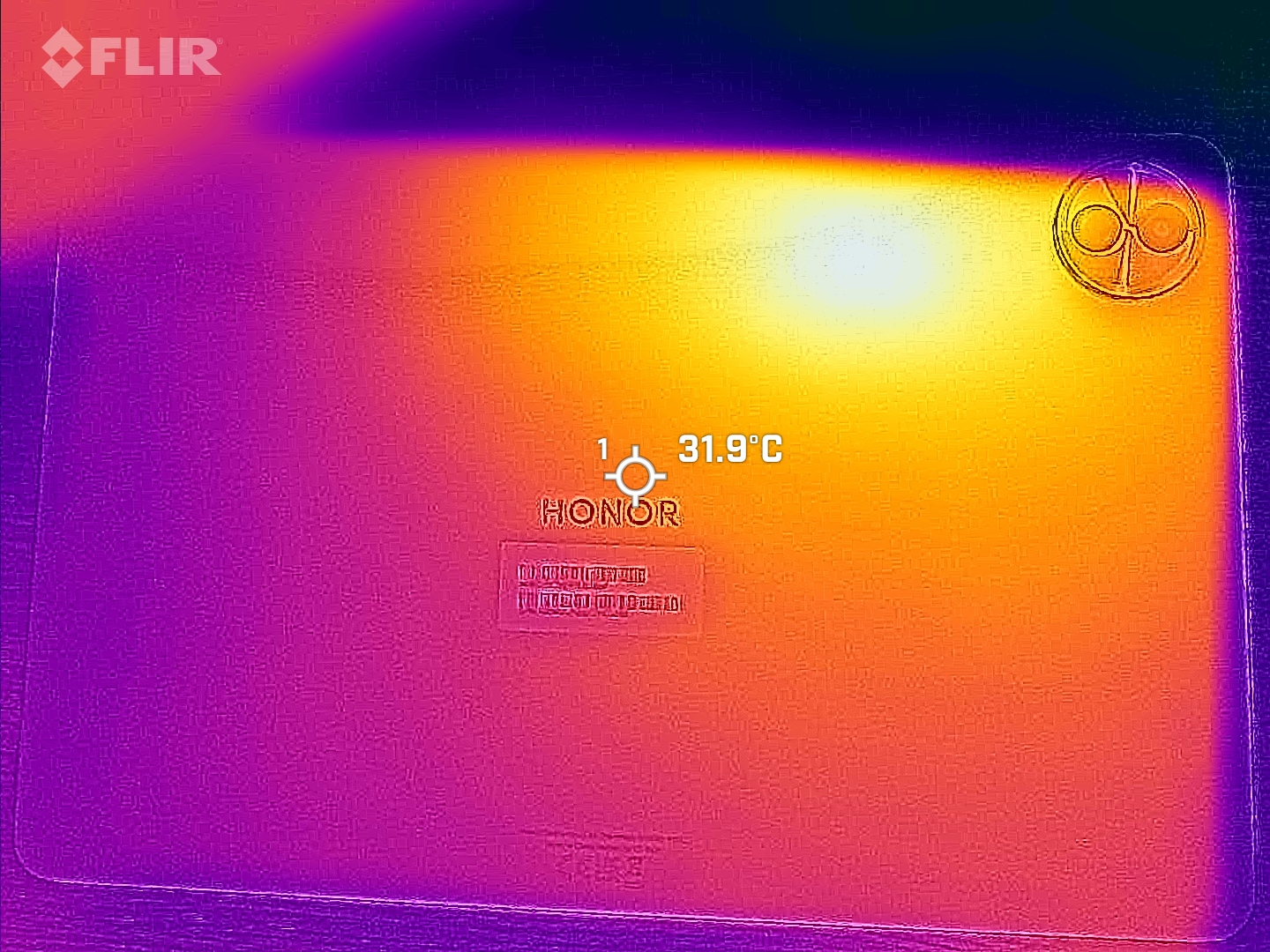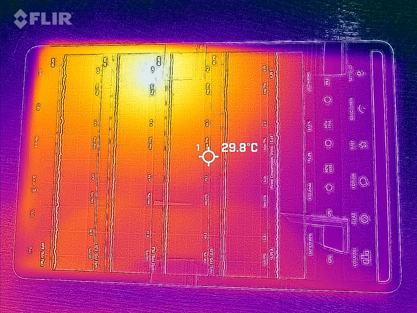 (+) In idle usage, the average temperature for the upper side is 24.1 °C / 75 F, compared to the device average of 30 °C / 86 F.