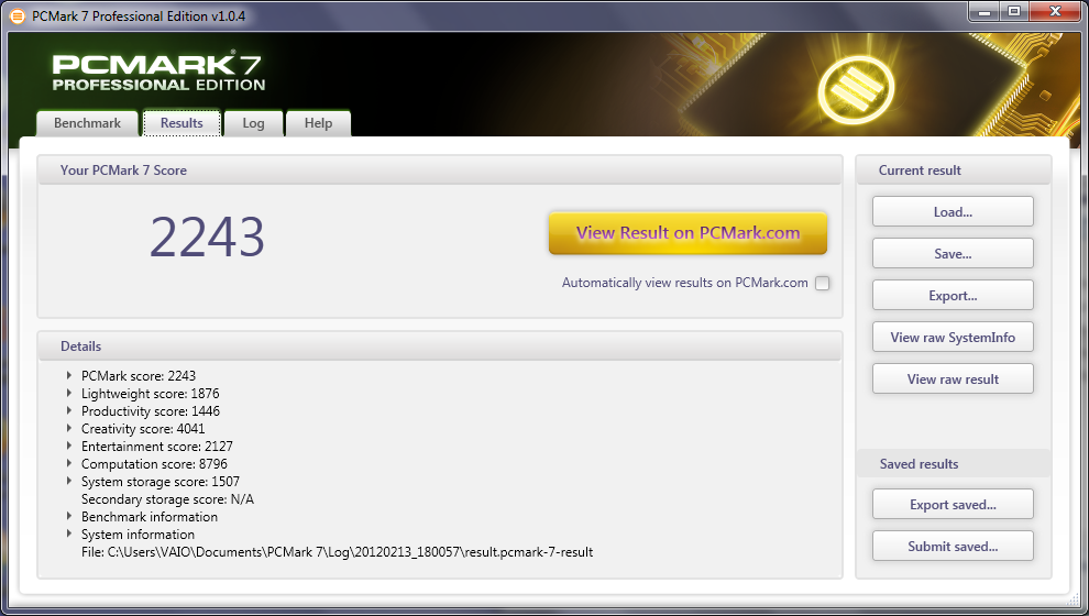 General system performance was assessed with PCMark Vantage and PCMark 7. Respectively, the Vaio E was able to score 6521 and 2243 points in these PCMark suites, the former of which places the Sony in the same league as some Core i7 notebooks (e.g., Acer Timeline 8573TG with Core i7-2620M and Toshiba Satellite P775-100 with Core i7-2630QM). On the other end of the spectrum, the integrated graphics means that the Sony's 3DMark Vantage score was unimpressive at only 1644 points. In other words, multi-tasking applications is subjectively fast on the Vaio E (which can be further improved with an SSD), just don’t expect to be able to run 3D-intensive programs at their full potential.