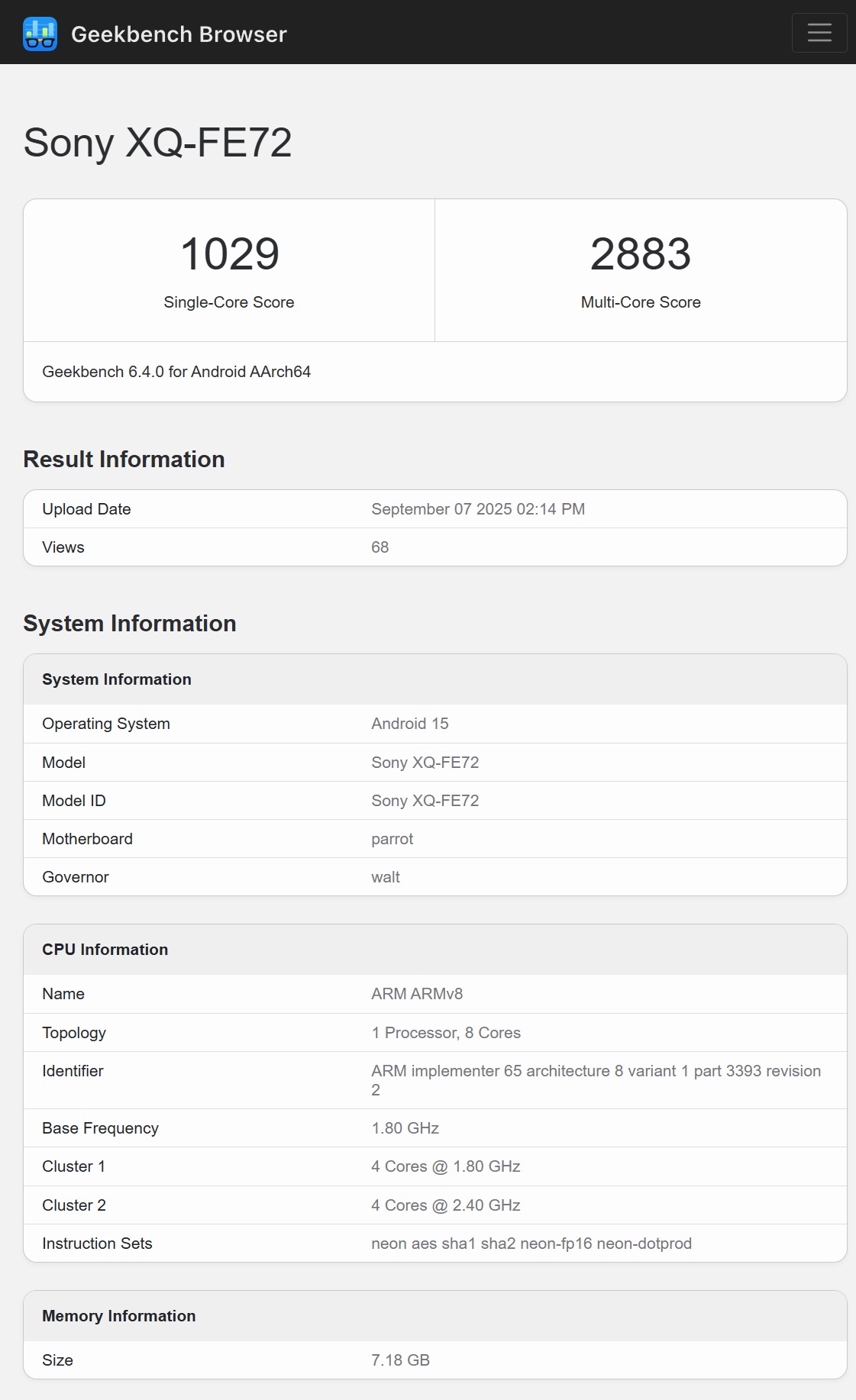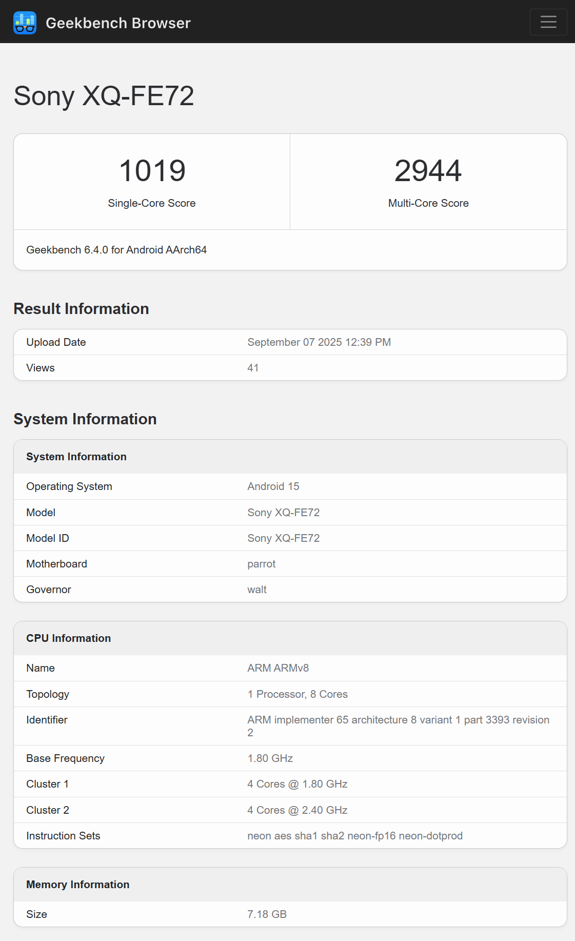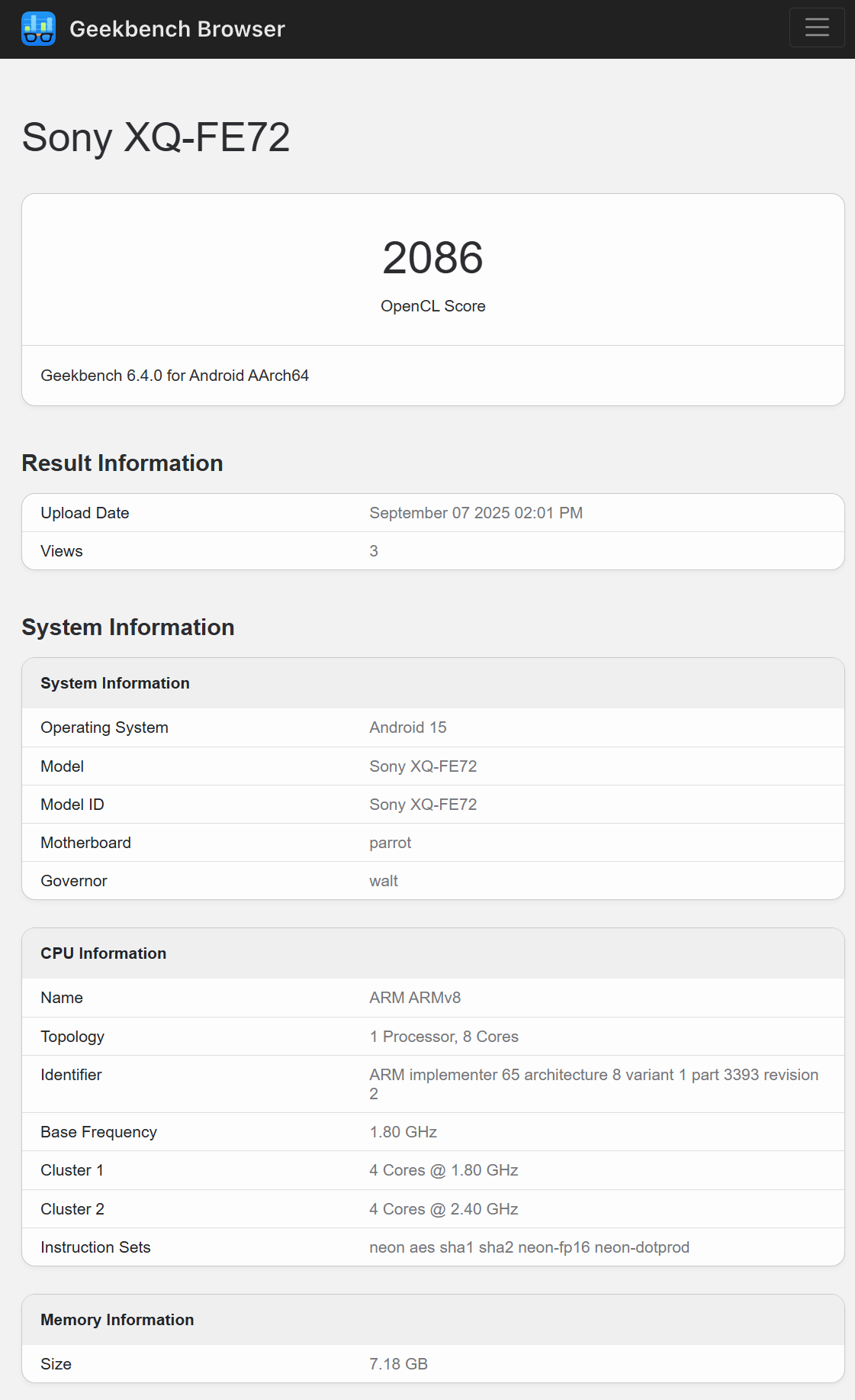 Shared with the Moto G75 and Galaxy A36 (curr. $399 on Amazon), the Snapdragon 6 Gen 3 helps the Xperia 10 VII outperform its predecessor by 8% in single-core tasks and less than 1% in multi-core tasks. Conversely, the Xperia 10 VII achieves 58% higher OpenCL scores from its Adreno 710 GPU. A release date for Sony's next mid-range smartphone has escaped leaks for now, though, as has launch pricing.