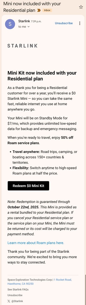 Lucky Residential subscribers who have received the email will be able to claim a Starlink Mini dish at no extra cost. All you have to do is click the “Redeem $0 Mini Kit button in the email, confirm the order, and the dish will be delivered to your address. SpaceX notes that the redemption link is valid till October 22nd. In addition, the email also mentions that users will get 50% off Roam plans, meaning you’ll only have to pay $82.5 for the Roam Unlimited plan and $25 for Mini Roam. Usually, these plans cost $165 and $50, respectively. It’s not immediately clear if the discounted pricing is only valid for the first few months of the service or a permanent perk for eligible Residential users.