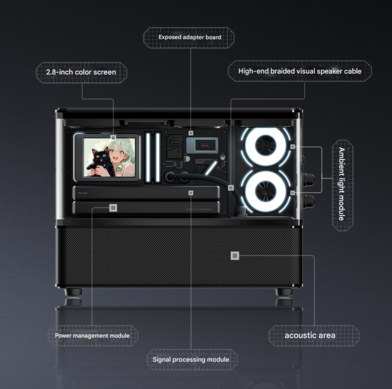 At first glance, the Edifier New Cyber speaker could easily be mistaken for a compact gaming computer. To create this look, Edifier has made the upper half of the case transparent and packed the power supply and electronics into two modules modeled after the shape of a graphics card. The RAM and two fans are simulated by a row of LEDs.