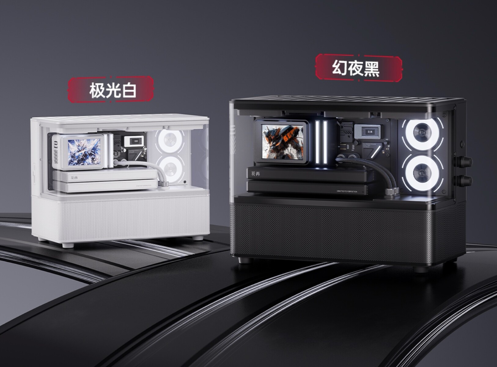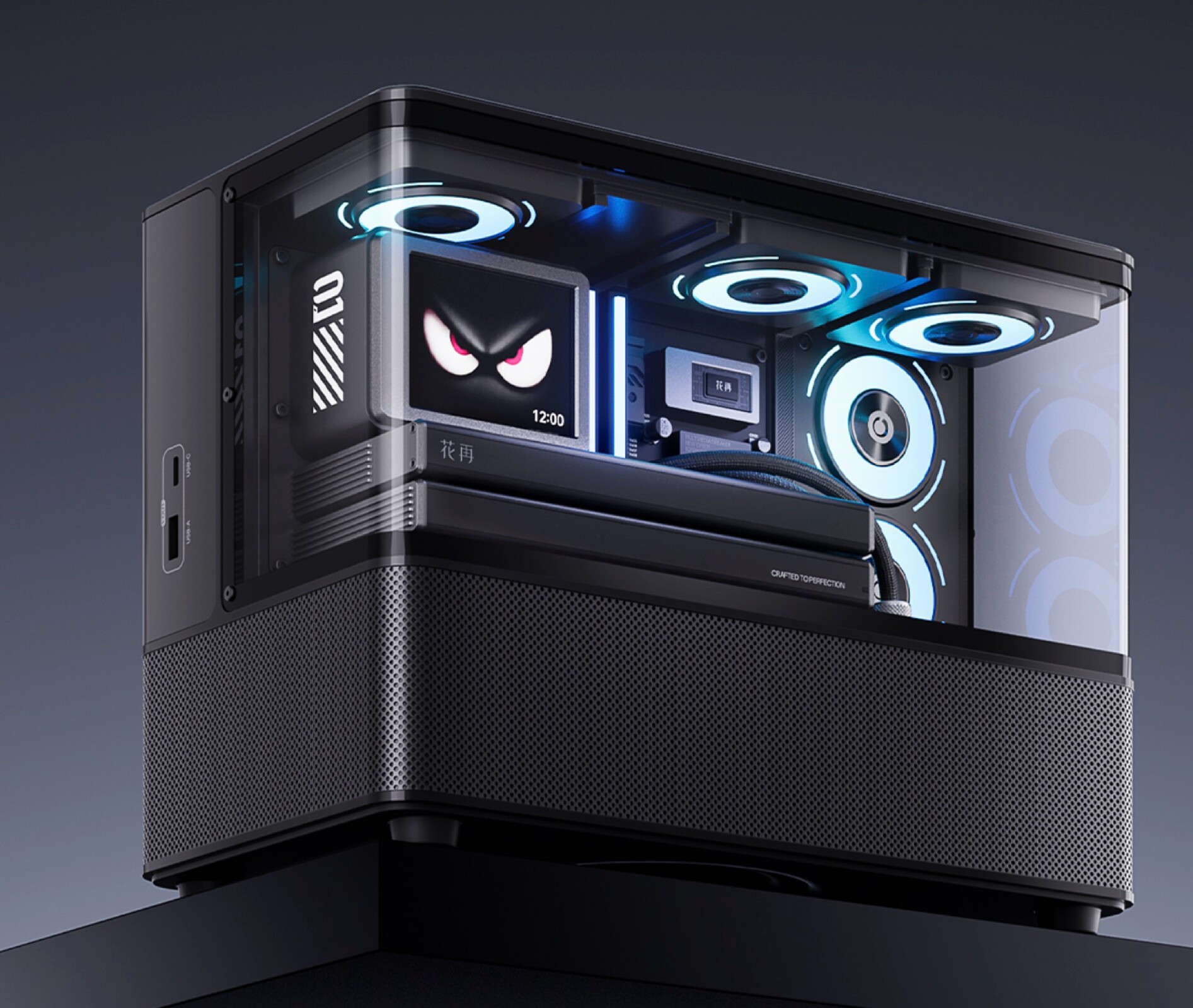 The thick, braided speaker cables are reminiscent of the ducts of a liquid cooling system, while the 2.8-inch touchscreen symbolizes the CPU cooler. This display can not only display graphics and animations but can even show the current CPU and GPU load as well as RAM usage of a connected computer, making the illusion even more effective. On the back of the speaker are a USB-C and a USB-A port, each capable of charging connected devices with up to 35 watts.